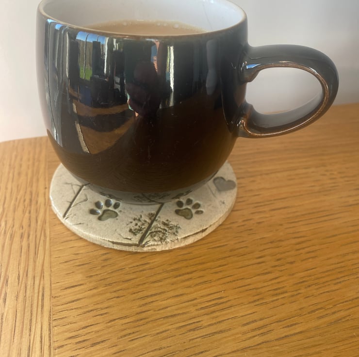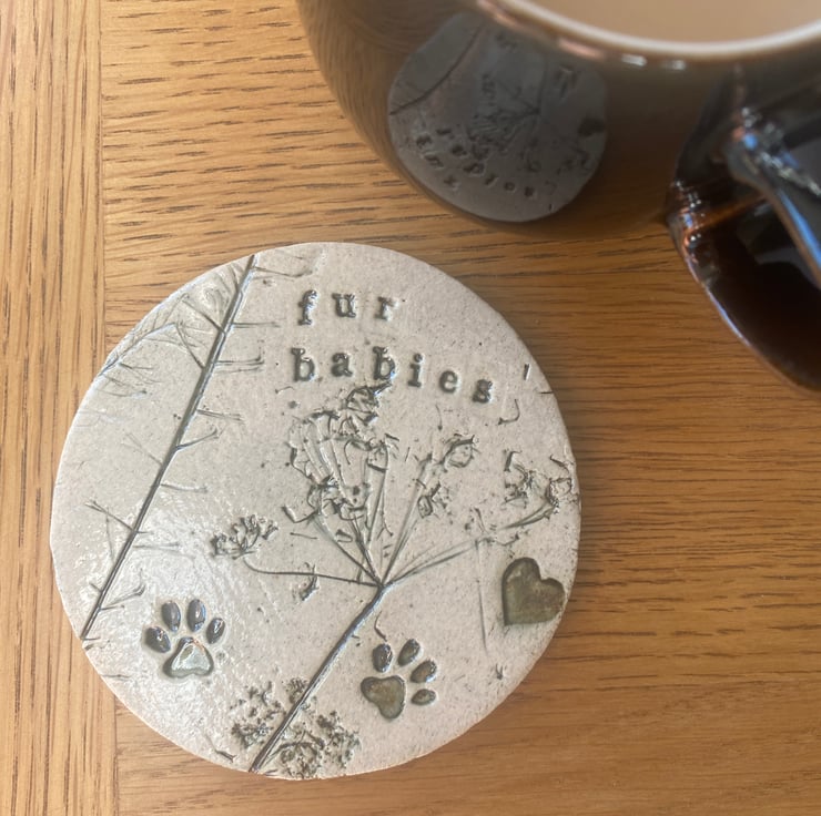 Perfect gift for a dog lover with cute paw prints, hedgerow flowers and letters hand pressed in the clay. 10cm diameter