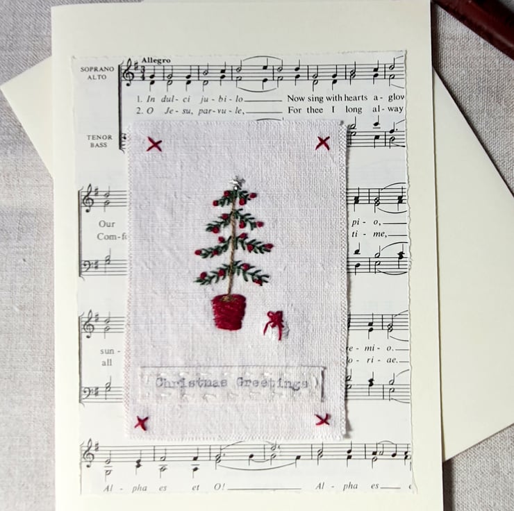More than a card! Hand embroidered on vintage linen and mounted on a piece of vintage sheet music on a blank card for your own message. Ideal for when you want to give more than a card as this beautiful card can be framed afterwards.