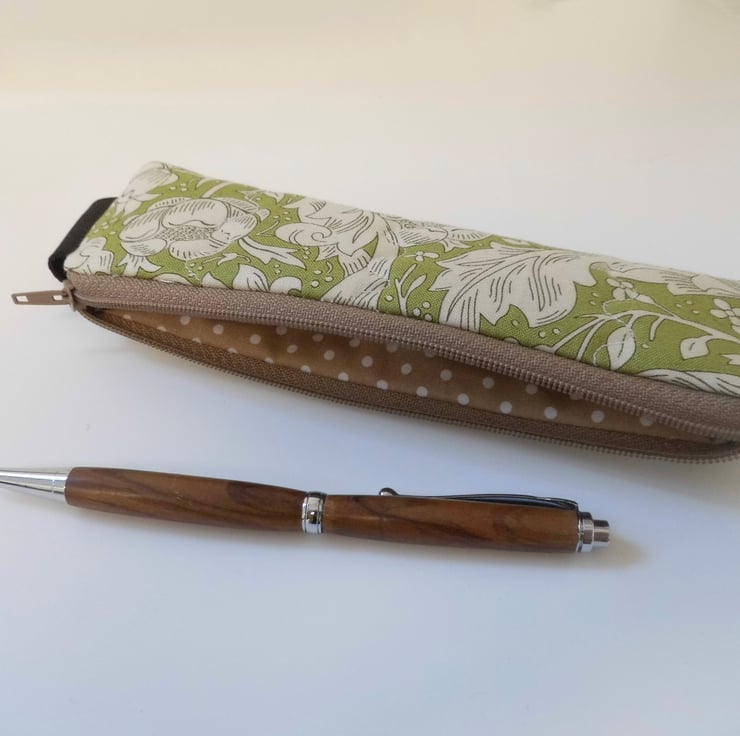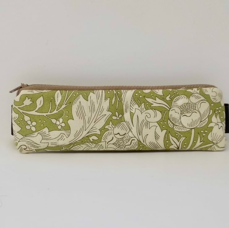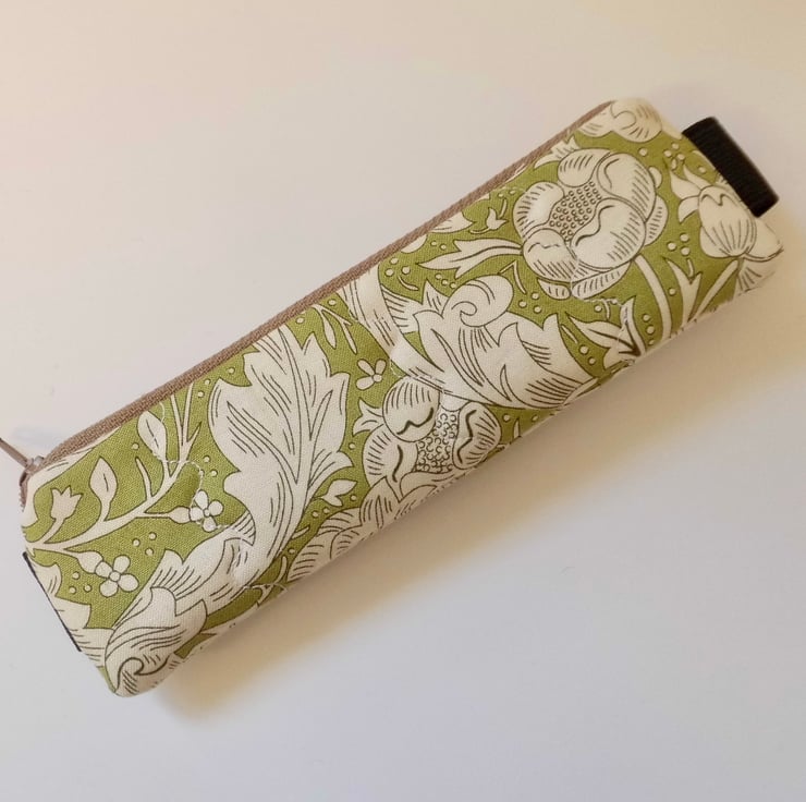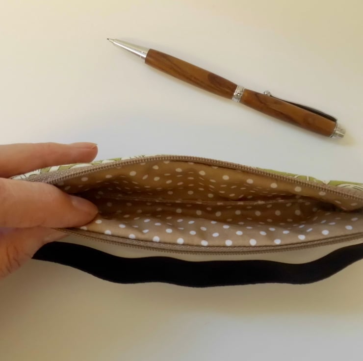 This one is made in William Morris design fabric called Bachelors fern, a cream leafy design on a vintage green background. I backed this fabric with fusible quilters wadding and then machined three rows each side in wave stitch to achieve a lightly quilted effect. Lined with a coffee coloured spotted cotton.