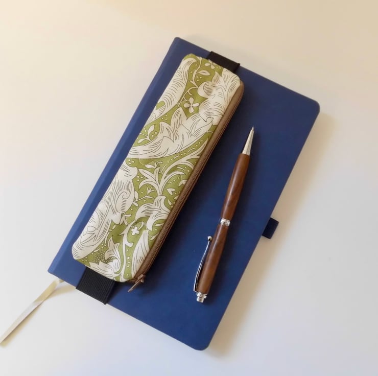 A mini pencil case designed to be kept on the front cover of your diary or journal, held in place with an elastic strap. Just slip it on the front cover and you can always have a pen and pencil to hand. Add it to whichever notebook you are using for the day.