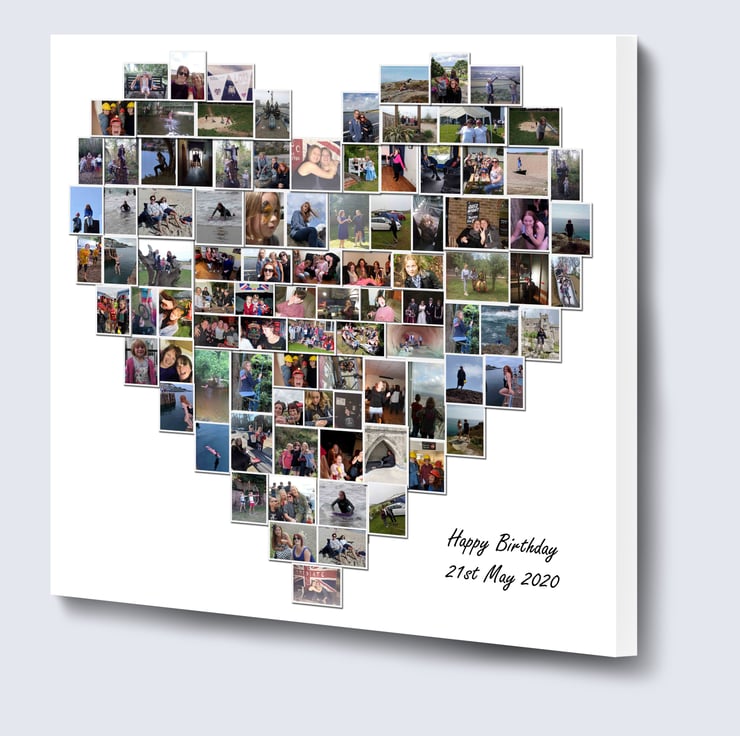 Fantastic personalised heart shaped photo collage canvas print. All pictures are individually placed to ensure faces can be seen and pictures are not cropped. Very easy to upload your pictures. Have your special memories in a beautiful collage. Perfect gift for birthdays, anniversaries, weddings and holidays.
