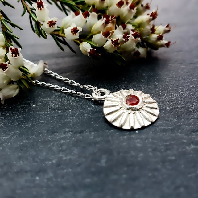 This sweet little daisy pendant has been handmade using silver clay, before setting a sparkling 3mm garnet cubic zirconia in the centre and firing it to create a solid fine silver pendant.