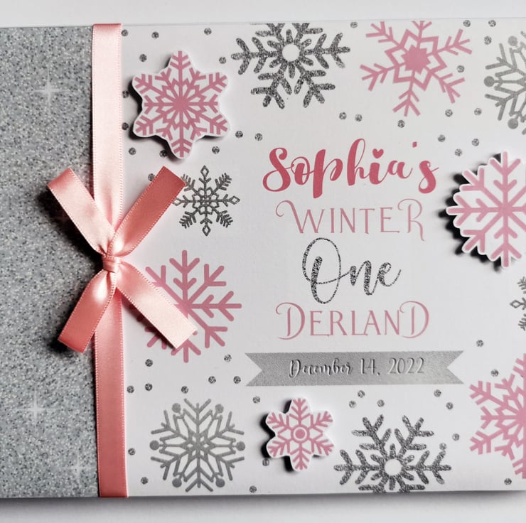 This Baby Shower Guest Book (First Birthday Book) is decorated with embellishments and a ribbon.
