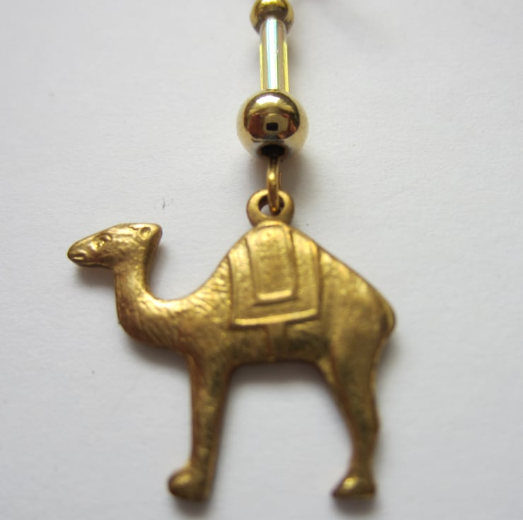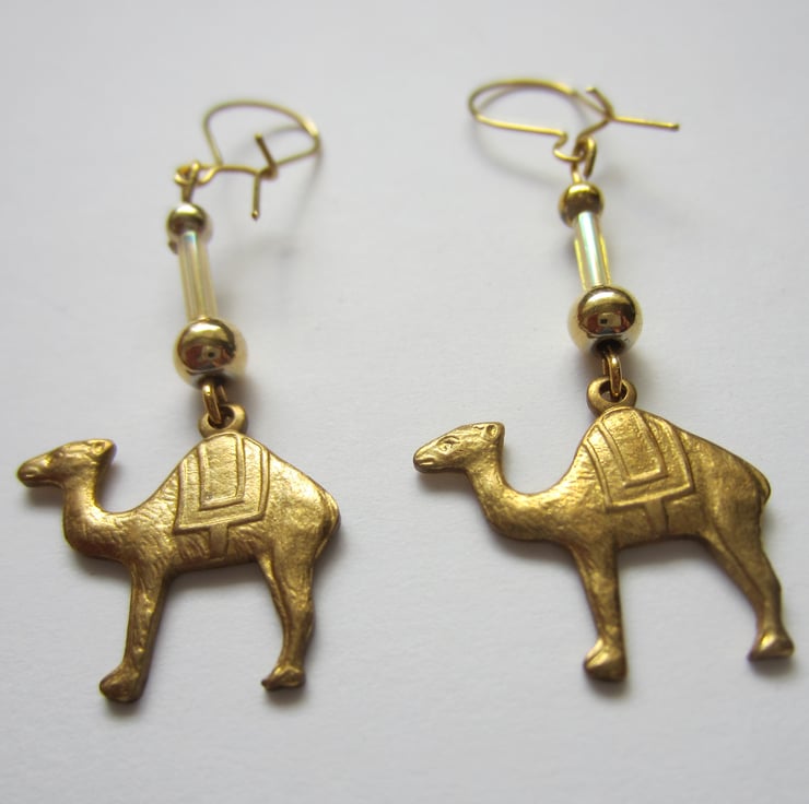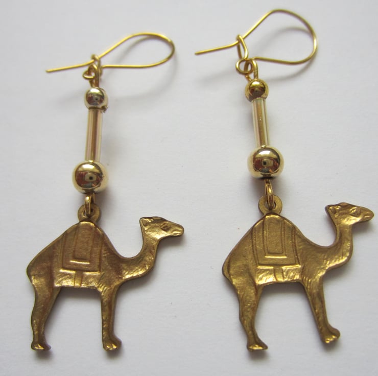 Fun dangle earrings made from quirky gold tone camel charms and beads. Light to wear, they hang from gold plated kidney shaped ear wires.