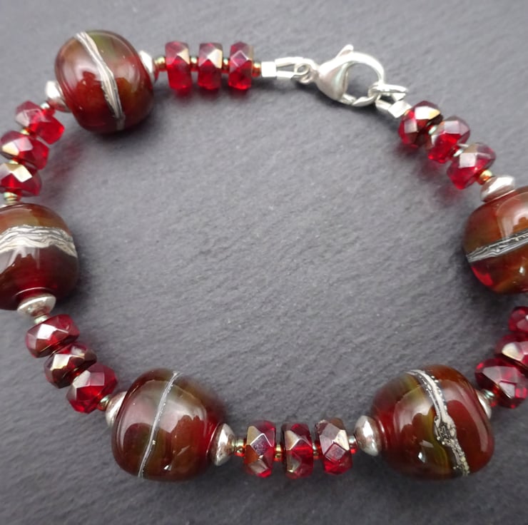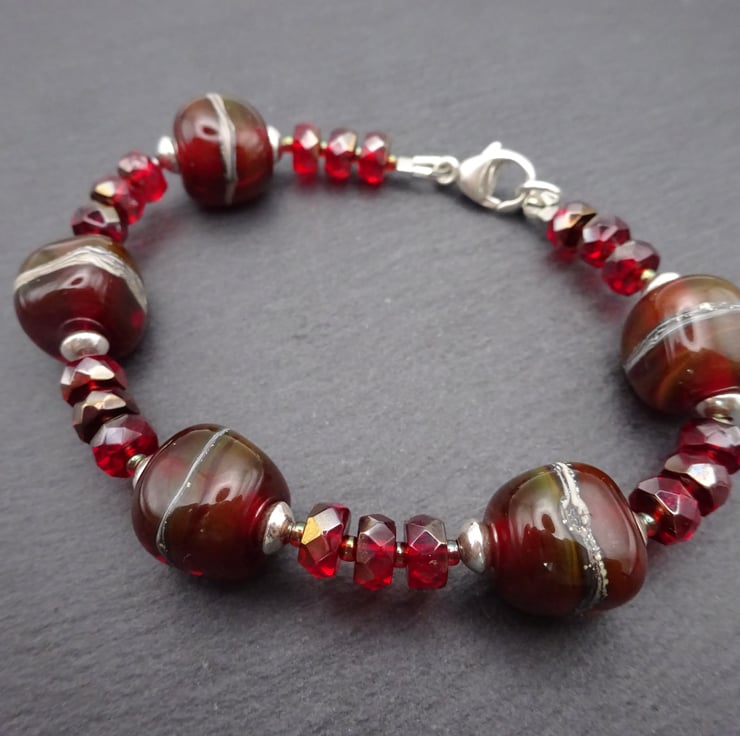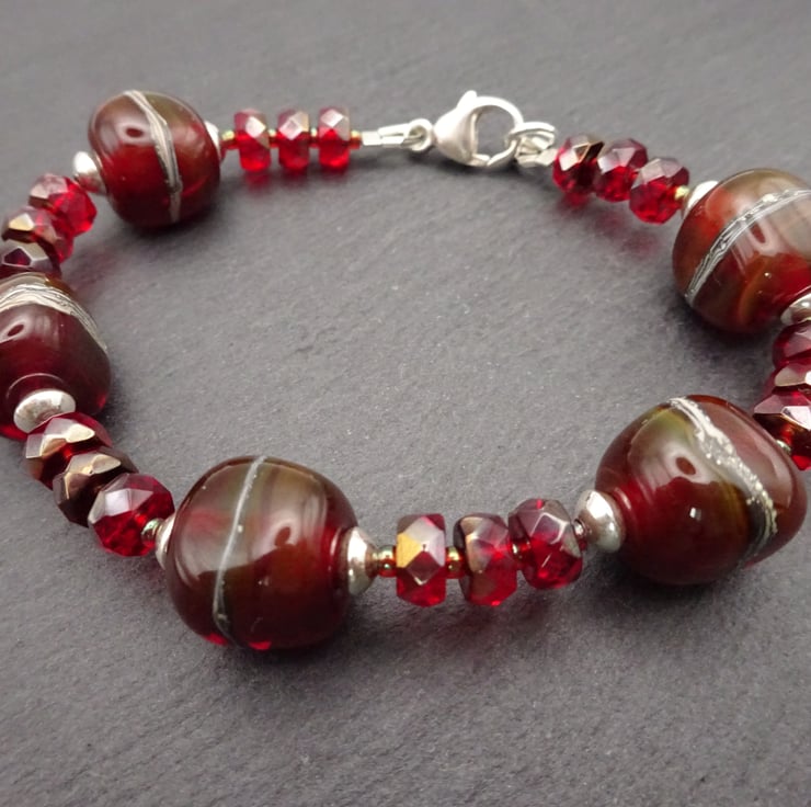 A bracelet made with handmade lampwork glass beads, red Czech glass beads and sterling silver beads.