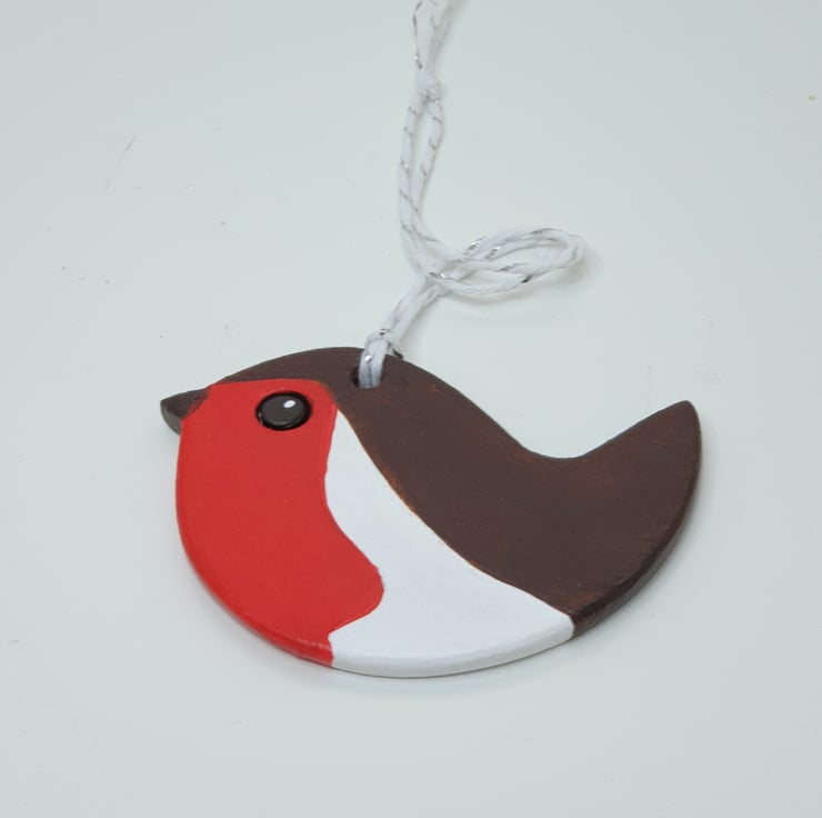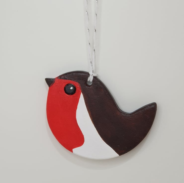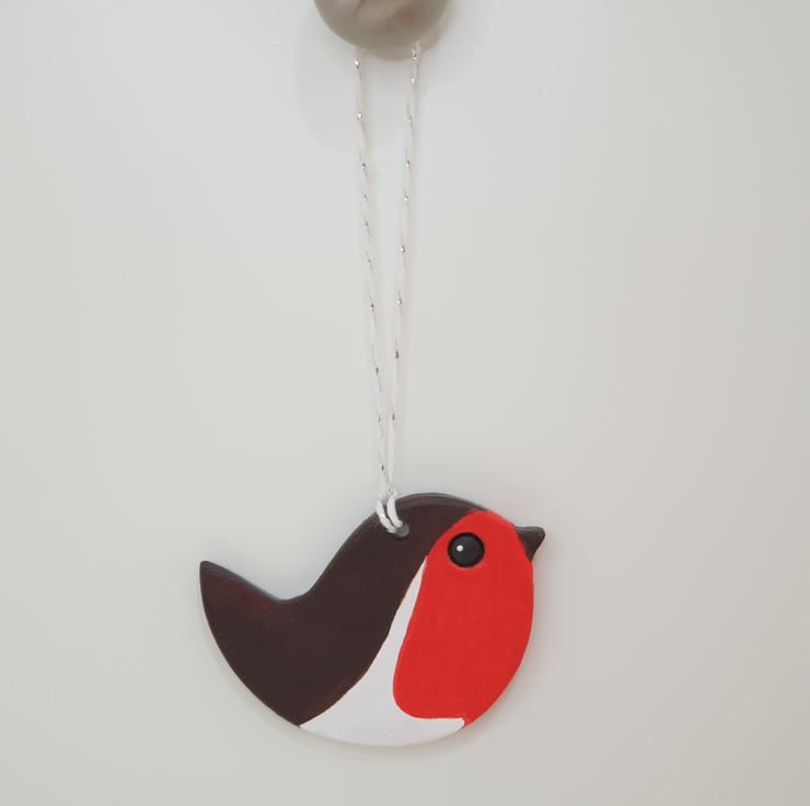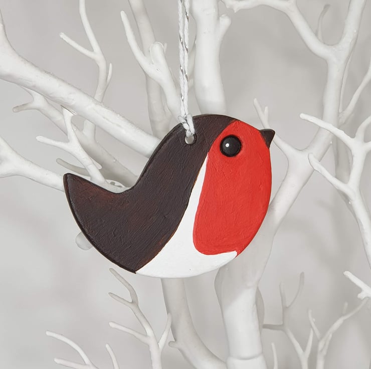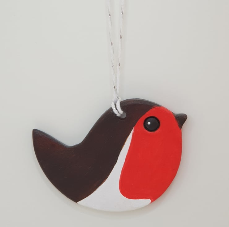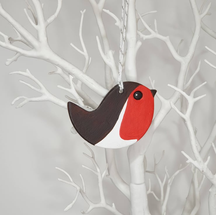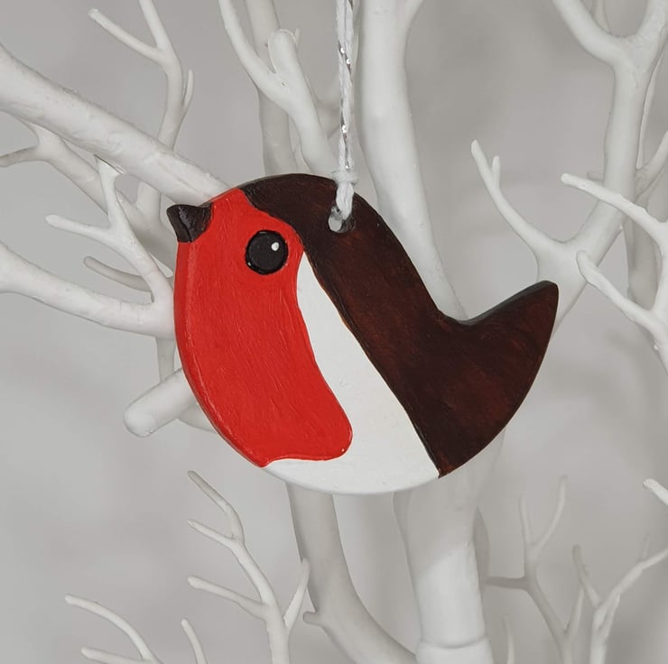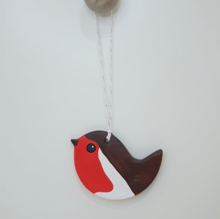 Pretty robin decoration which has been lovingly handmade from air dry clay and hand painted with acrylics on both sides and varnished. This cute bird can therefore be hung left or right facing.