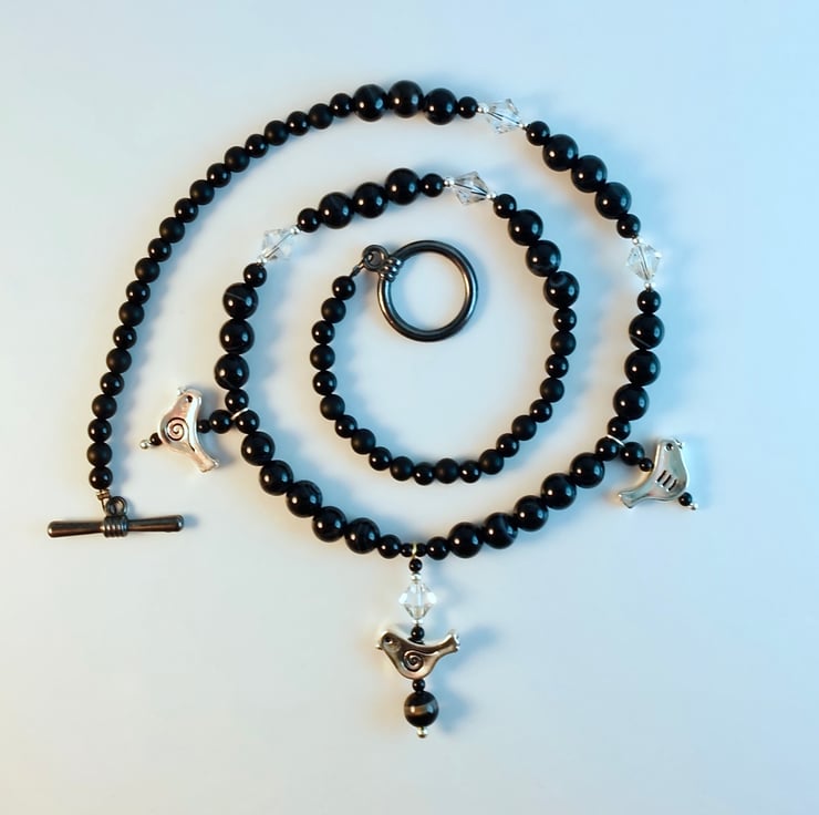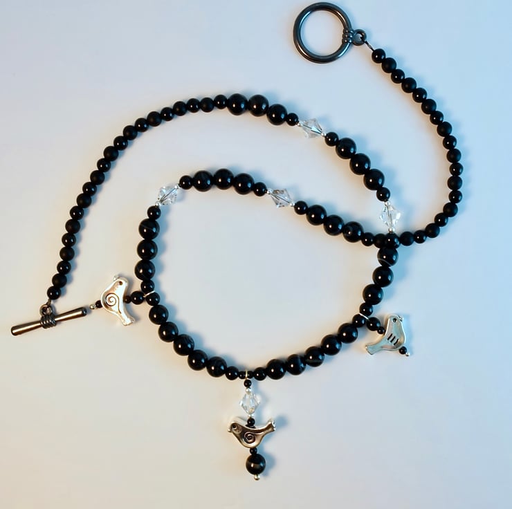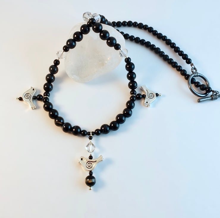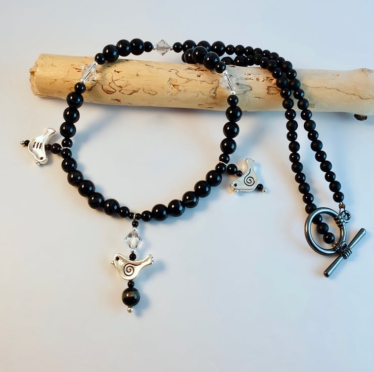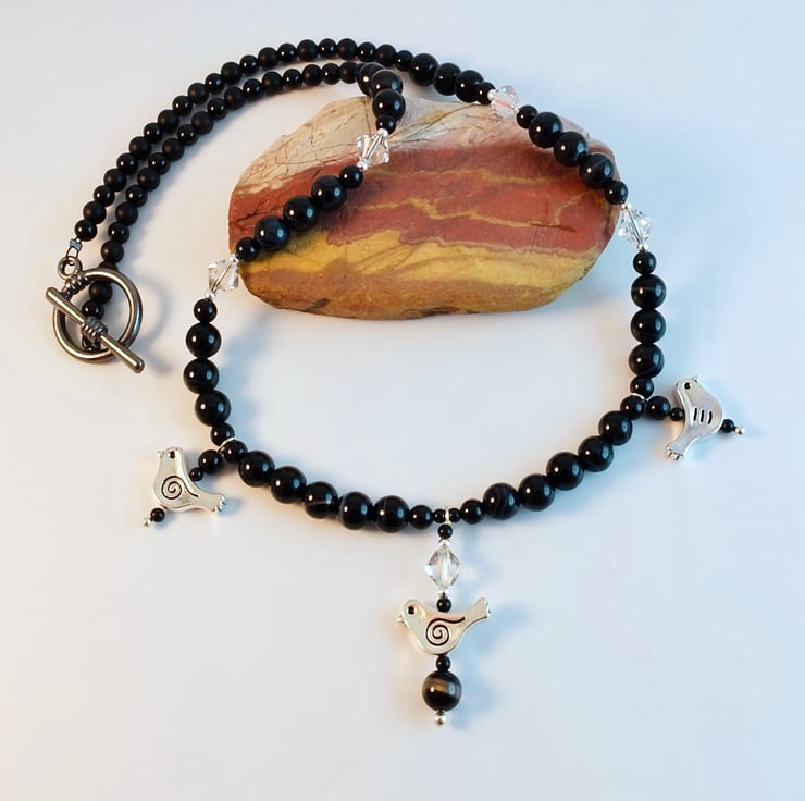 A versatile necklace made from 6mm banded Black Onyx beads set with three charms made from Tibetan silver bird beads, Black Onyx and a 6mm Swarovski 'silver shade' crystal for the central pendant.