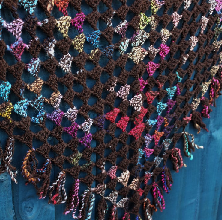 Crochet granny square fringed shawl in hand-spun pure wool - Design W529