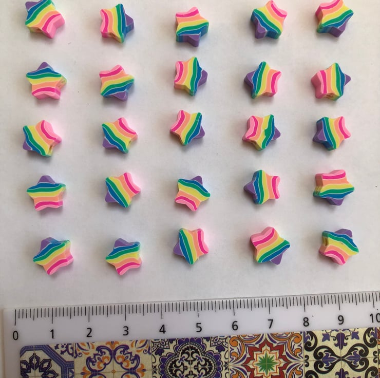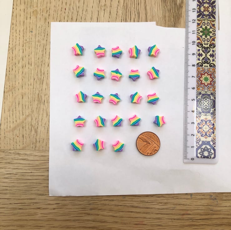 These lovely little polymer clay beads measure 10mm across and are 3mm in height. Each one is drilled wide enough to be strung with ease. There are 25 beads in each bundle (several bundles available).