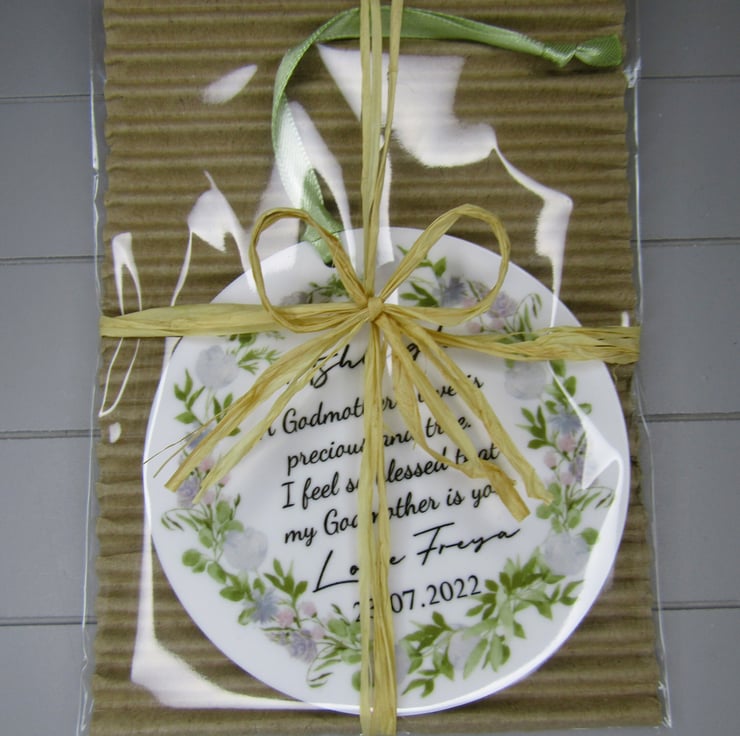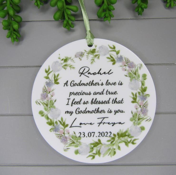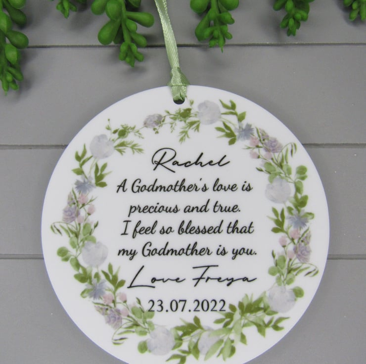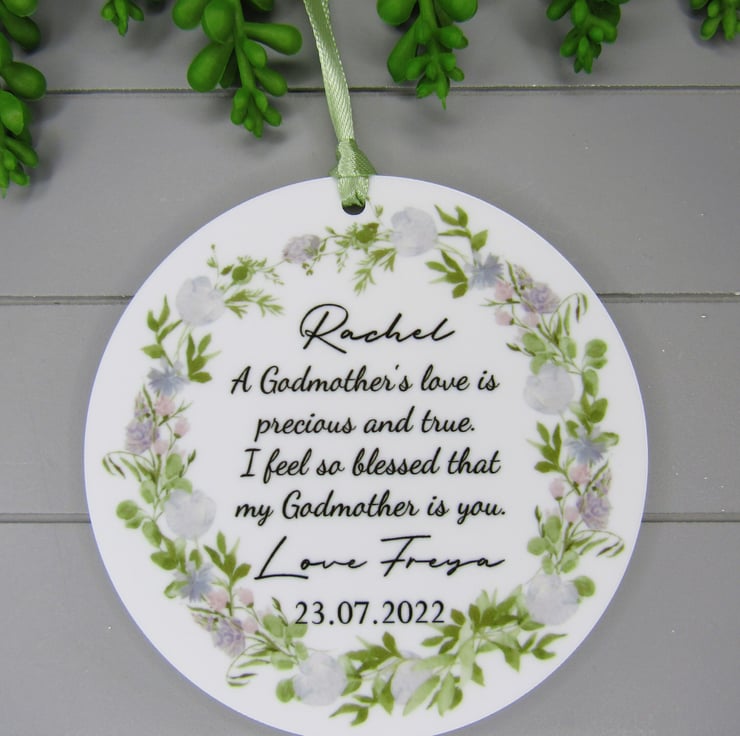 This 10cm acrylic ornament is personalised with the words- A Godmothers love is precious and true. I feel so blessed that my Godmother is you. It is signed with the child's name and the date of the christening. It would make a precious keepsake to say thank you for becoming a godparent. The disc is made from 3mm thick white acrylic.