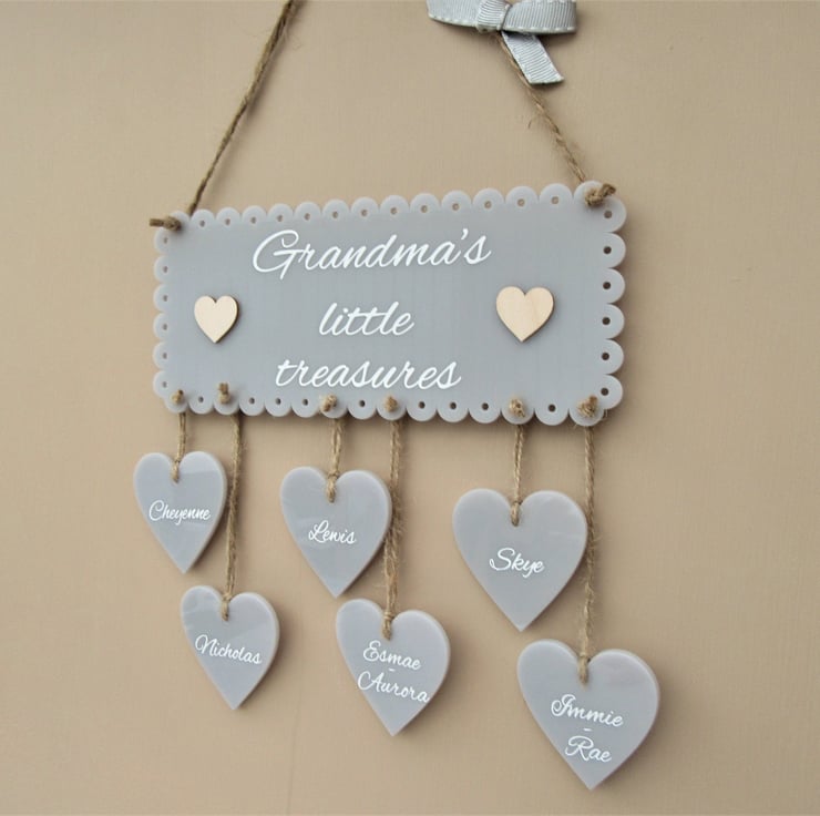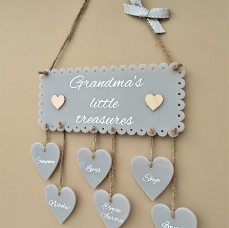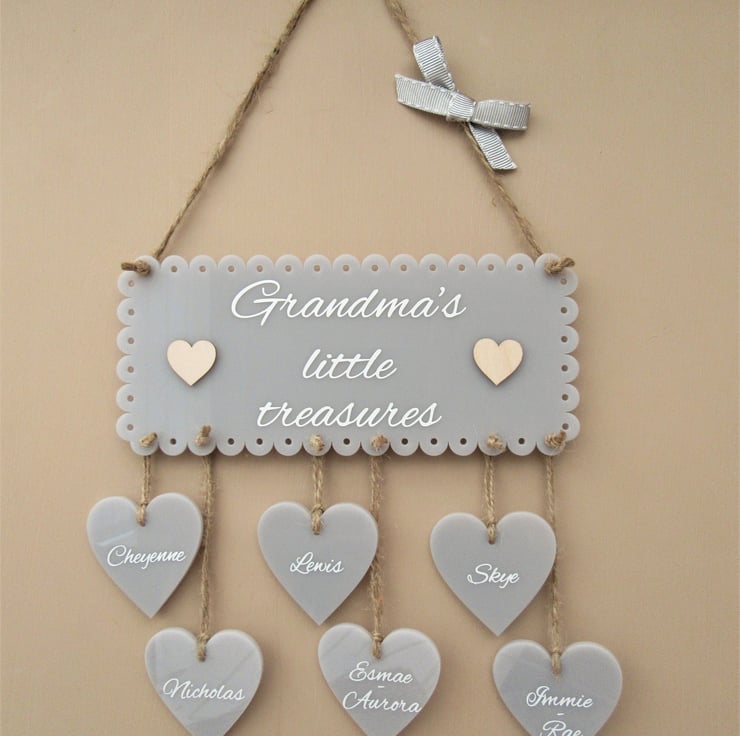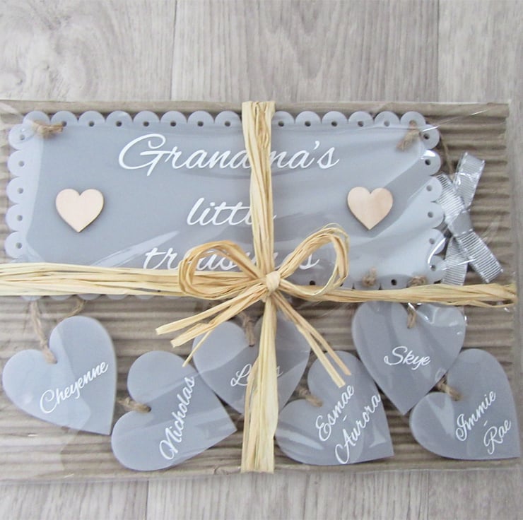 Quote reads: "Grandma's little treasures" Also available with Gran's, Granny's, Nana's, Nanny's, Nan's or Personalised to a name of your choice. Please select which one you would prefer from the drop down menu. Main plaque & hanging hearts are made from high quality 3mm thick perspex acrylic in a metallic pearl, gloss light grey or a matt mineral grey frost colour. Writing is in a gloss black vinyl with the metallic pearl option or matt white vinyl on the grey versions. Embellished with wooden hearts and finished with a light grey or grey saddle stitch bow. Size of the plaque is 8.2 cm x 18.7 cm with 5 cm hanging hearts. The plaque comes wrapped in a clear cellophane bag, backed with padded corrugated card & wrapped with natural raffia ribbon. Making this a great gift for any occasion.
