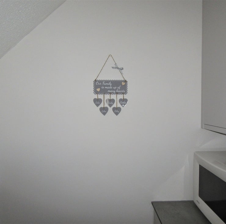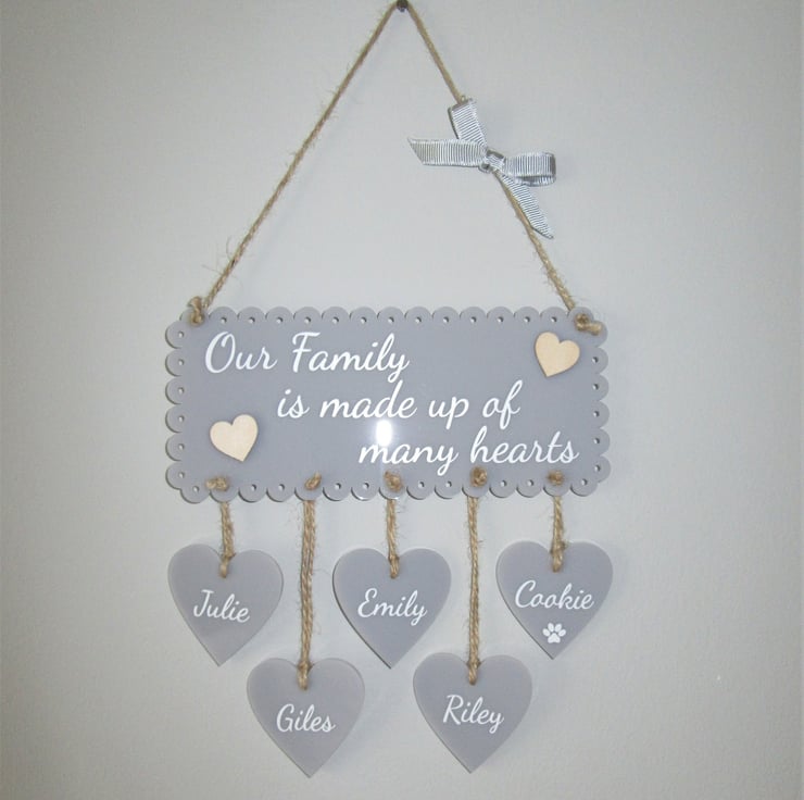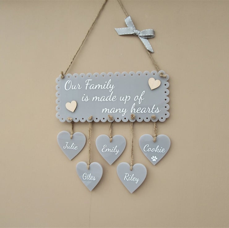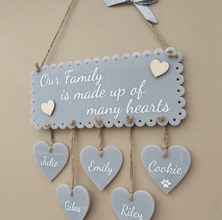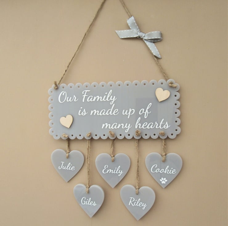 Main plaque & hanging hearts are made from high quality 3mm thick perspex acrylic in a metallic pearl, gloss light grey or a matt mineral grey frost colour. Writing is in a black vinyl with the metallic pearl option or white vinyl on the grey versions. Embellished with wooden hearts and finished with a light grey or grey saddle stitch bow.