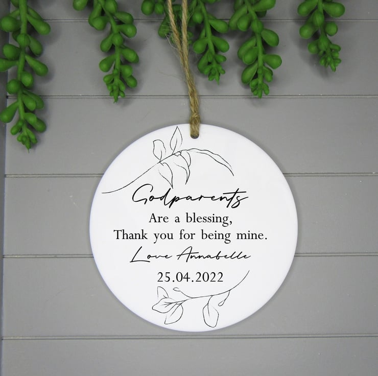 This 10cm acrylic ornament is personalised with the words- Godmother, Godfather, Godparents or personalised to a title of your choice and is signed with the child's name. Please note the longer the name the smaller the writing with be. The date of the christening can also be added. It would make a precious keepsake to say thank you for becoming a godparent. The disc is made from 3mm thick white acrylic.