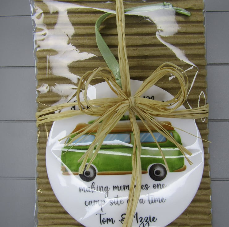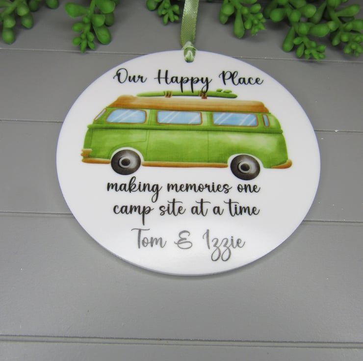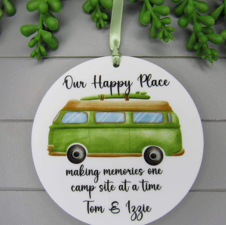 This 10cm acrylic keepsake ornament is personalised with the words- 'Our happy place. Making memories one camp site at a time' and personalised with the van owners names. It would make a great gift to hang in the camper van and is suitable for any occasion such as Father's day, birthday etc. The disc is made from 3mm thick white acrylic.