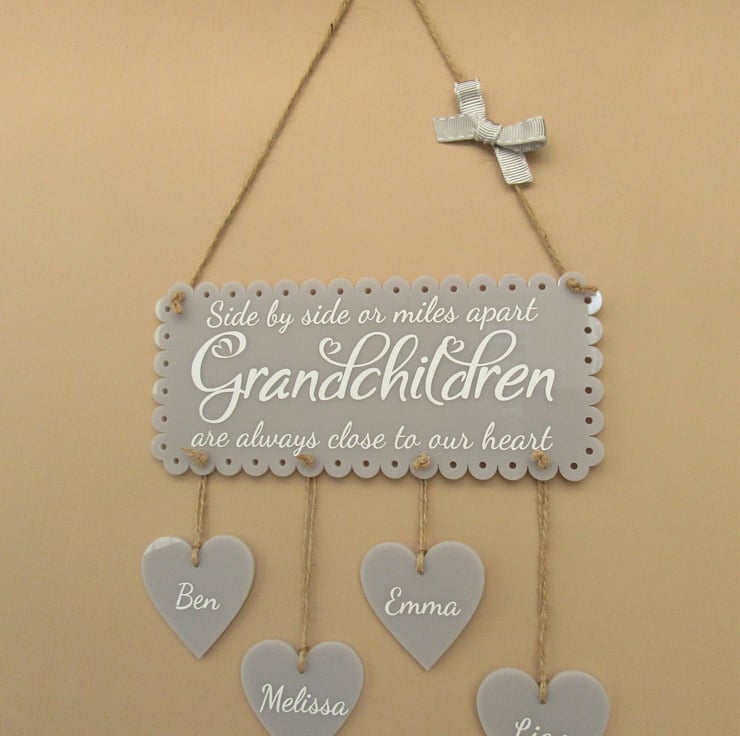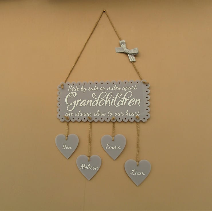 Main plaque & hanging hearts are made from high quality 3mm thick perspex acrylic in a metallic pearl, gloss light grey or a matt mineral grey frost colour. Writing is in a gloss black vinyl with the metallic pearl option or matt white vinyl on the grey versions. Finished with a bow.