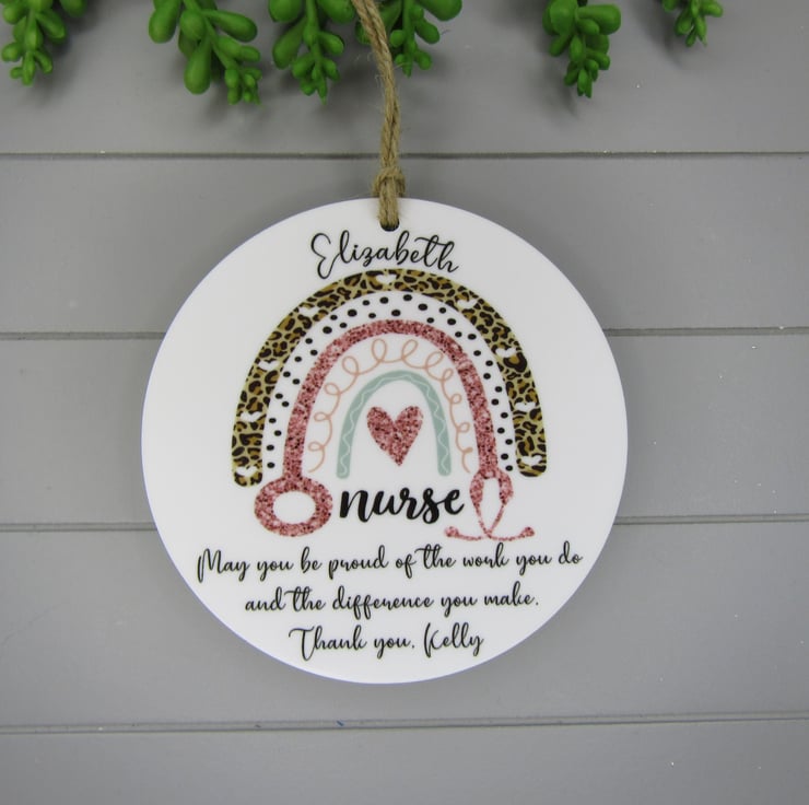 This 10cm acrylic ornament is personalised with the words- May you be proud of the work you do and the difference you make. It would make a great thank you keepsake gift. The disc is made from 3mm thick white acrylic.