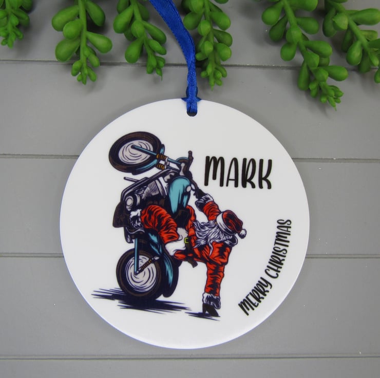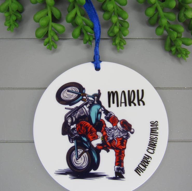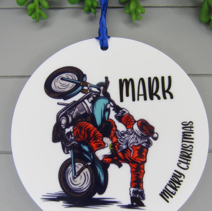 This is a very cool 10cm acrylic keepsake of Santa doing a wheelie on a motorbike. It can be personalised with any name and the has the words Merry Christmas along the edge. It would make a great gift for a motorbike fan at Christmas time. The disc is made from 3mm thick white acrylic.