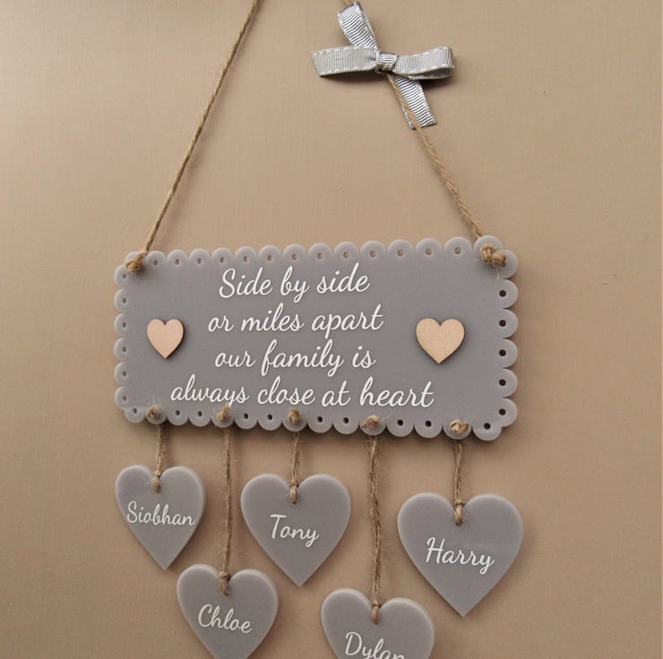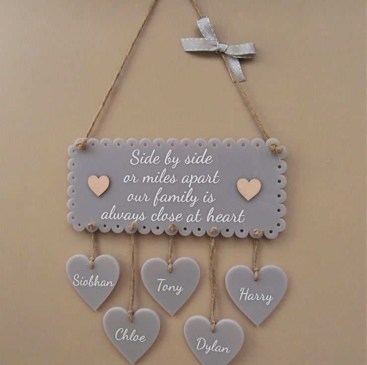 Main plaque & hanging hearts are made from high quality 3mm thick perspex acrylic in a gloss light grey or a matt mineral grey frost colour. Writing is in a white vinyl. Embellished with wooden hearts and finished with a light grey or grey saddle stitch bow.