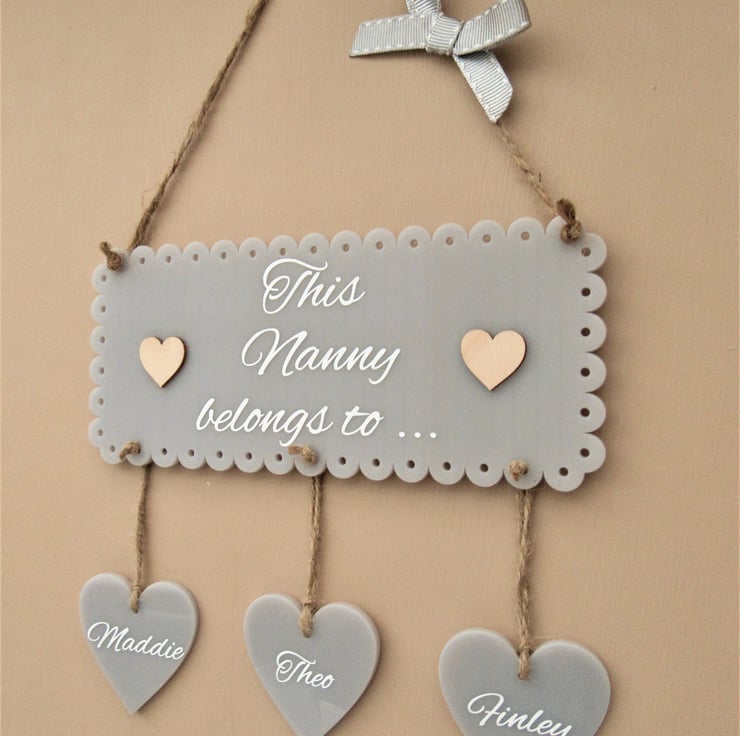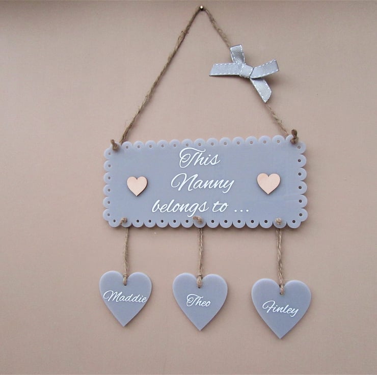 Main plaque & hanging hearts are made from high quality 3mm thick perspex acrylic in a gloss light grey colour. Writing is in a matt white vinyl. Embellished with wooden hearts and finished with a grey saddle stitch bow. Other colours available in the main shop.