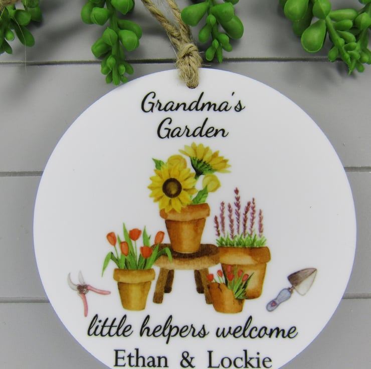 This 10cm acrylic ornament is personalised with the words- 'Grandma's Garden, little helpers welcome' and is signed with the children's name. It can also say shed, greenhouse etc (select the personalised option for this) and personalised to Granny, Gran, Nanny, Nan, Nana or personalised to a name relation of your choice. Please choose from the drop down menu which one you would prefer. It would make a precious keepsake for any occasion, Mother's day, birthday etc. The disc is made from 3mm thick white acrylic.