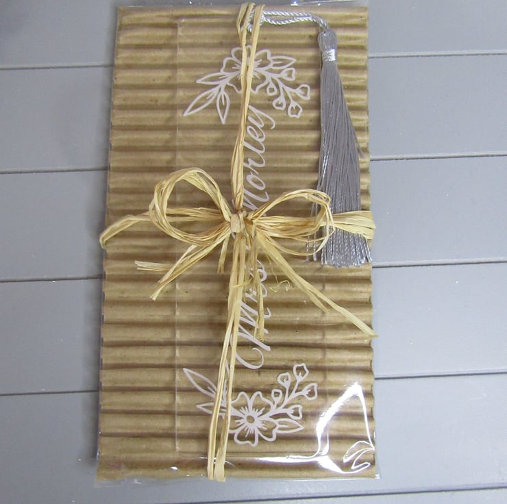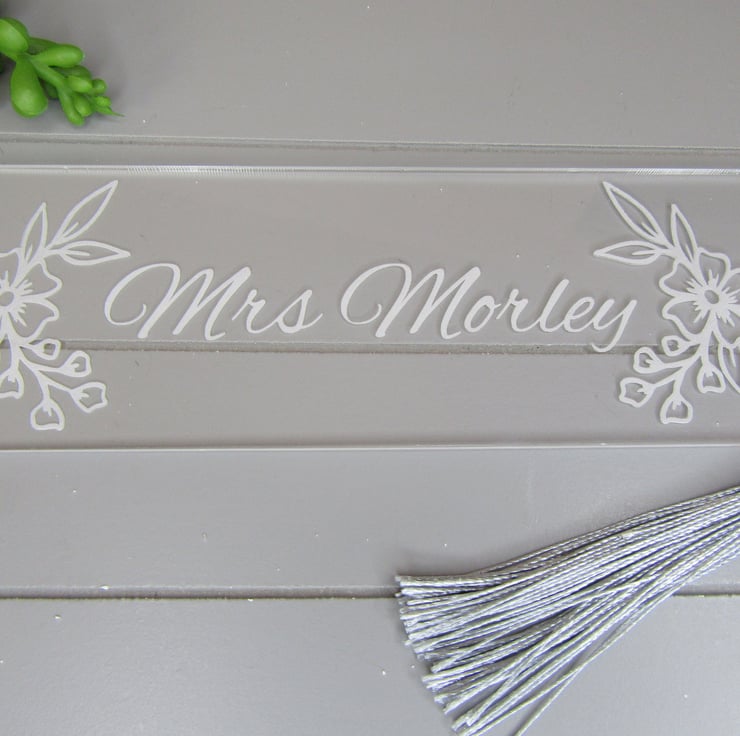 This pretty engraved flower bookmark would make a great end of term leaving gift or Christmas gift for a teacher or teaching assistant. It is personalised with the teacher's name and surrounded with engraved flowers on a acrylic bookmark and is finished with a tassel or ribbon. Each bookmark comes wrapped in a clear bag, backed with padded corrugated card & wrapped with natural raffia ribbon, ready to give as a gift.