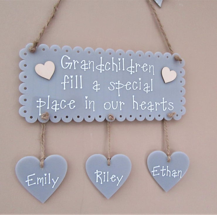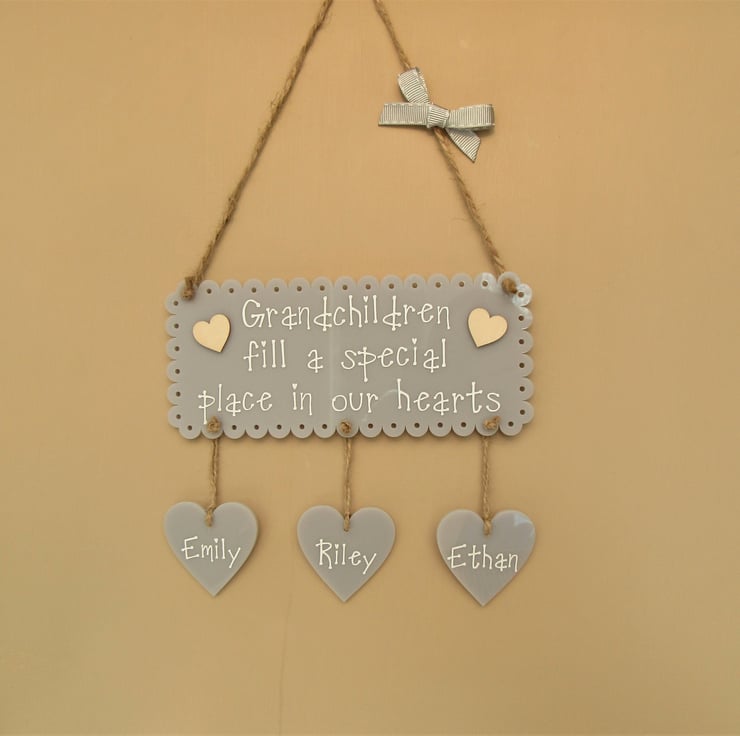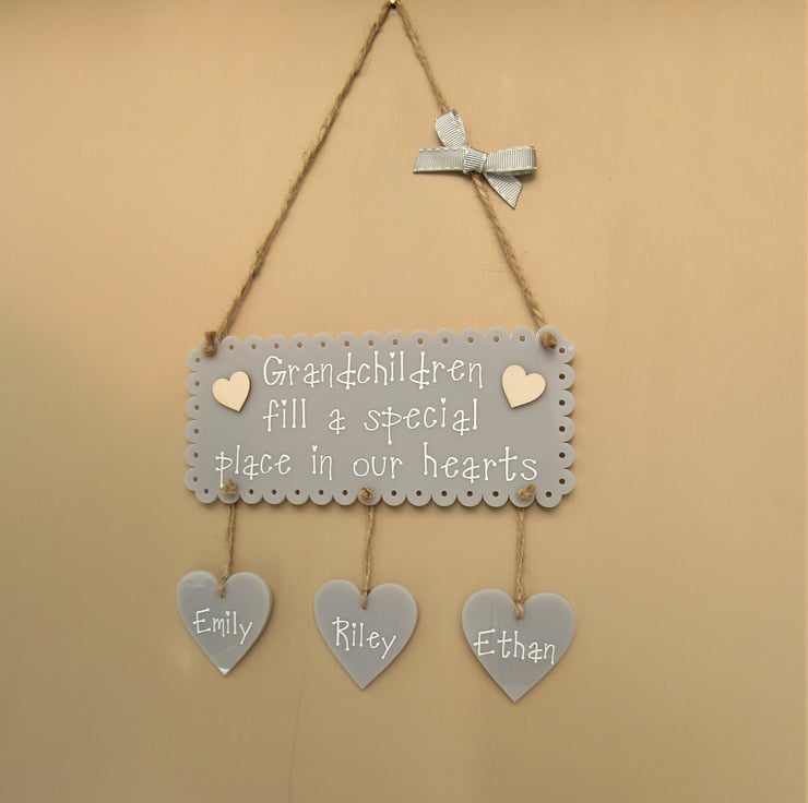 Hanging hearts are personalised with your grandchildren's names. Choose from the drop down menu the number of names required. Please leave a note in the personalisation box with the names you would like on the hearts. Please list names one per line using a capital letter and lowercase characters.
