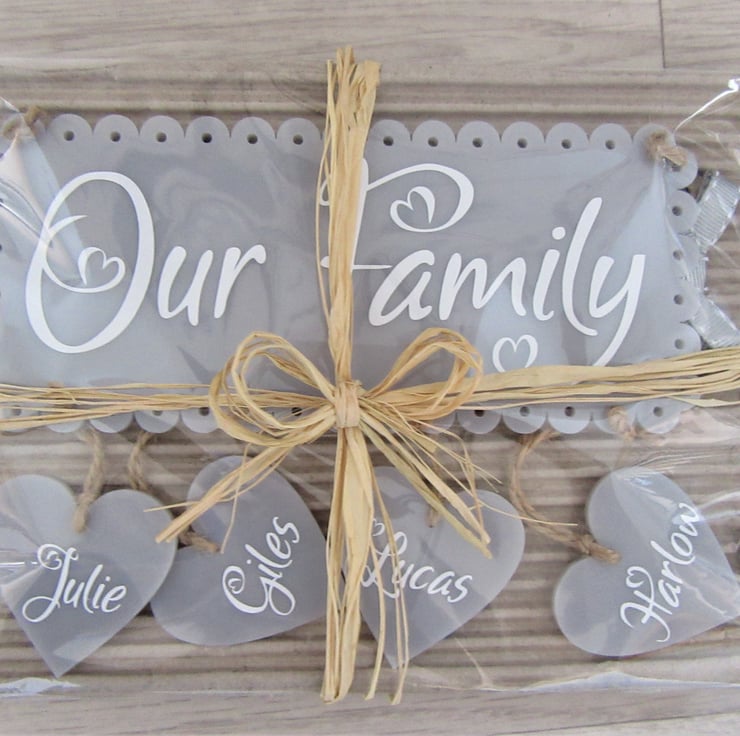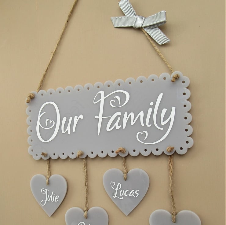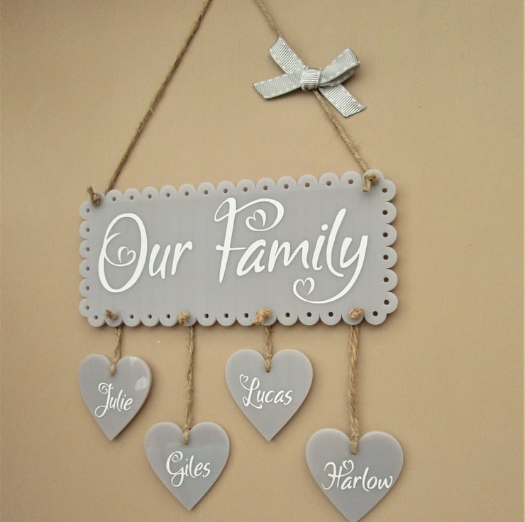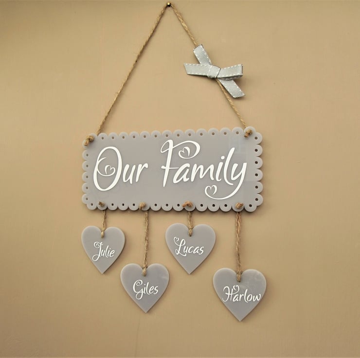 Main plaque & hanging hearts are made from high quality 3mm thick perspex acrylic in a metallic pearl, gloss light grey or a matt mineral grey frost colour. Writing is in a gloss black vinyl with the metallic pearl option or matt white vinyl on the grey versions. Embellished with wooden hearts and finished with a light grey or grey saddle stitch bow.