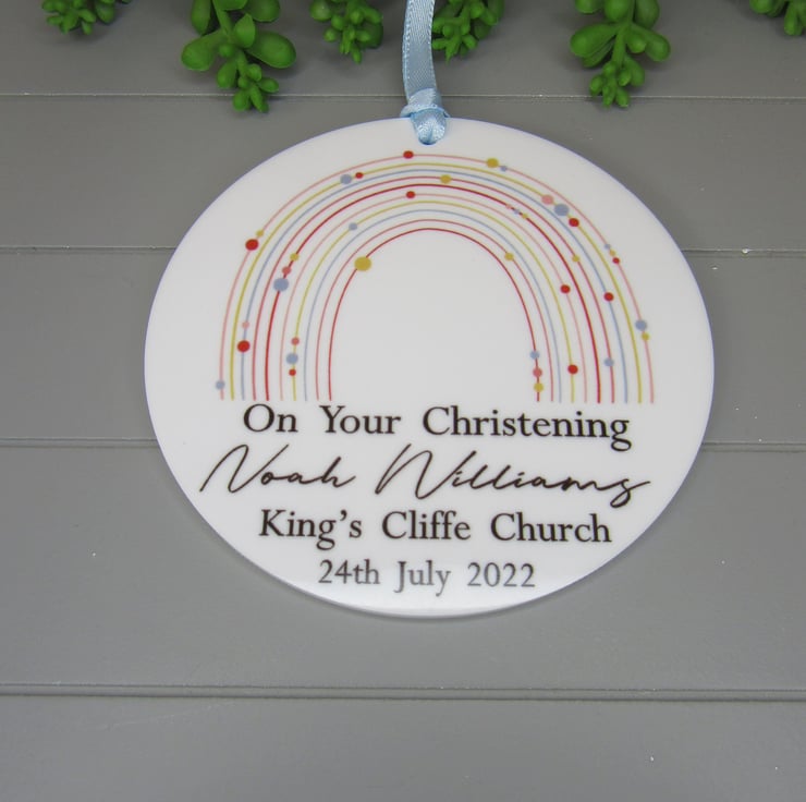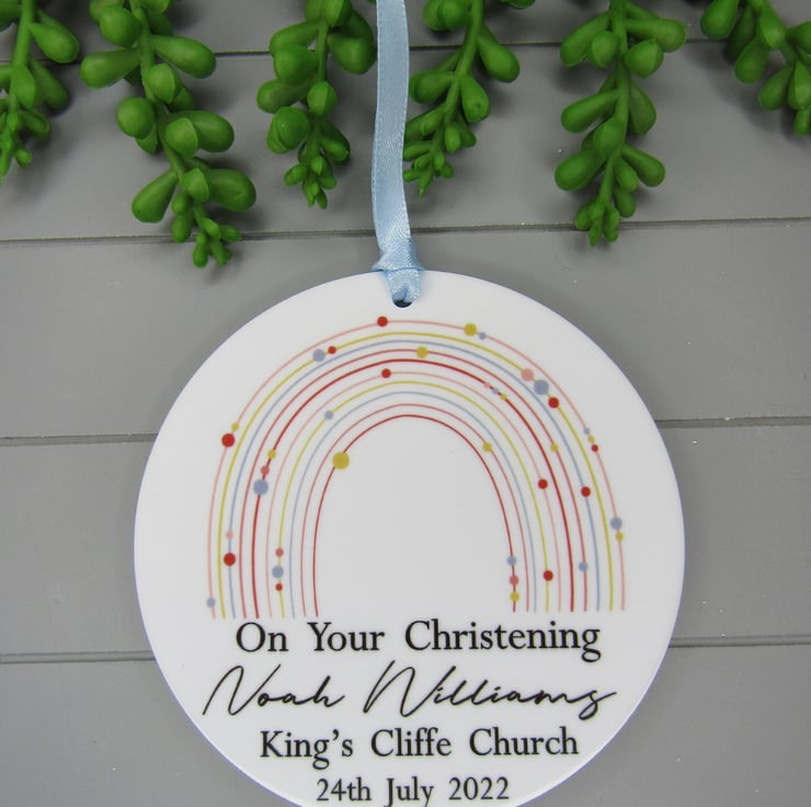 Personalised Christening gift. Dotty Rainbow for a Baby Boy, Baby Girl or Gender Neutral Ornament