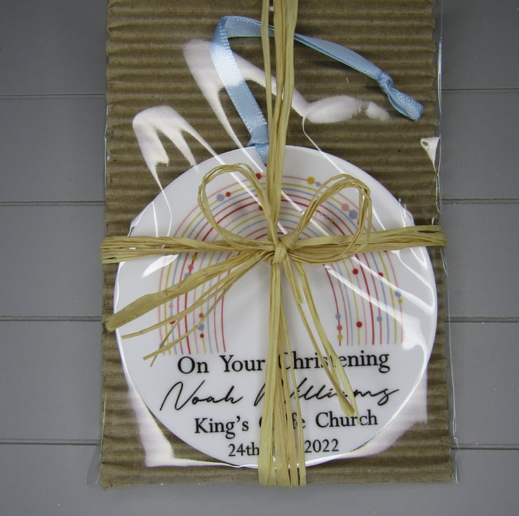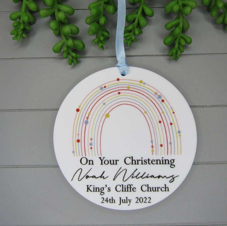 This 10cm acrylic ornament is personalised with the words- On Your Christening, name, date and church. It would make a precious keepsake. The disc is made from 3mm thick white acrylic. Also available On your dedication, On your baptism or personalised to a ceremony of your choice.