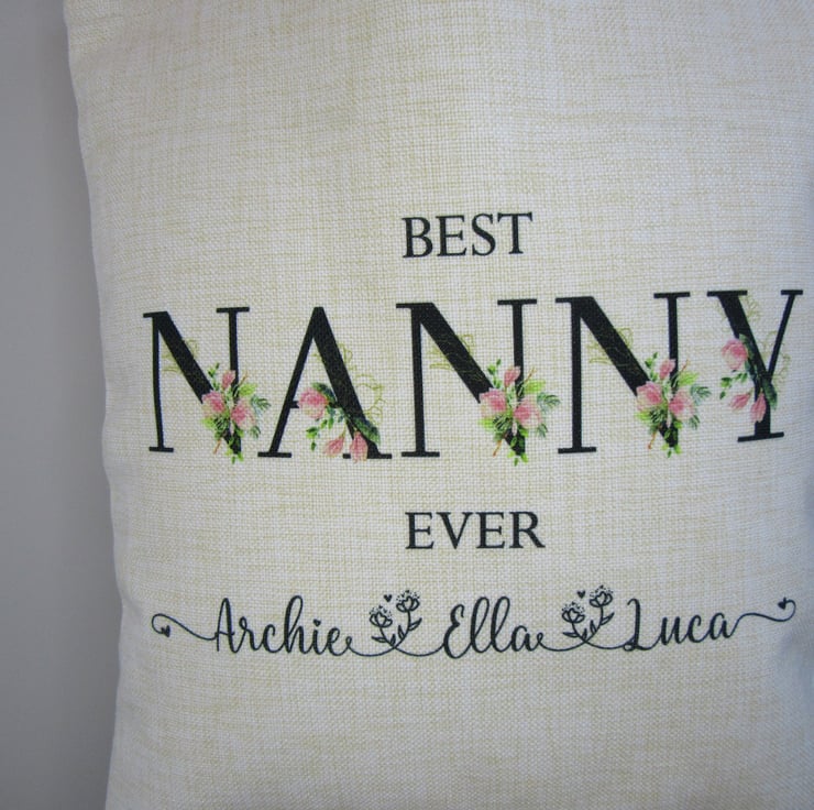 It is personalised with the grandchildren's names. The main quote reads - Best Nanny Ever. Also available with Gran, Granny, Grandma, Nana, Nanna, Nan, Mum, Mummy, Mam, Mammy or Personalised to a name of your choice. Please select which one you would prefer from the drop down menu.