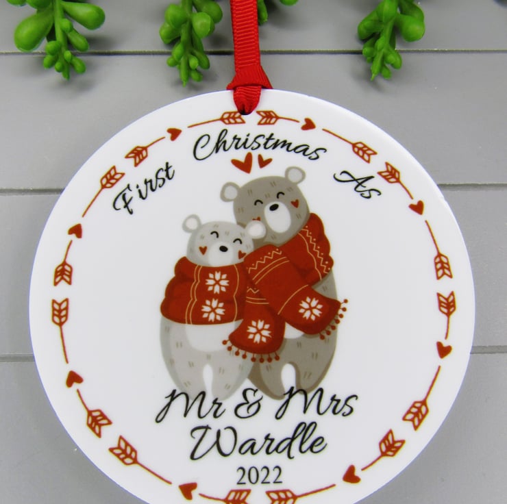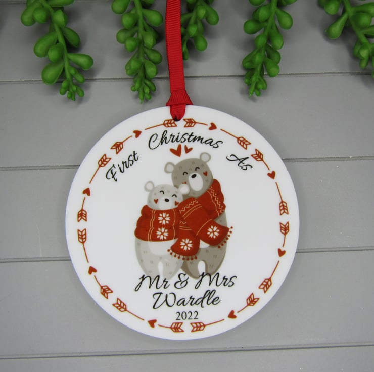 This 10cm acrylic ornament is personalised with the couples surname. It features a cute teddy bear couple. It would make a precious keepsake for the newlyweds 1st Christmas. The disc is made from 3mm thick white acrylic.