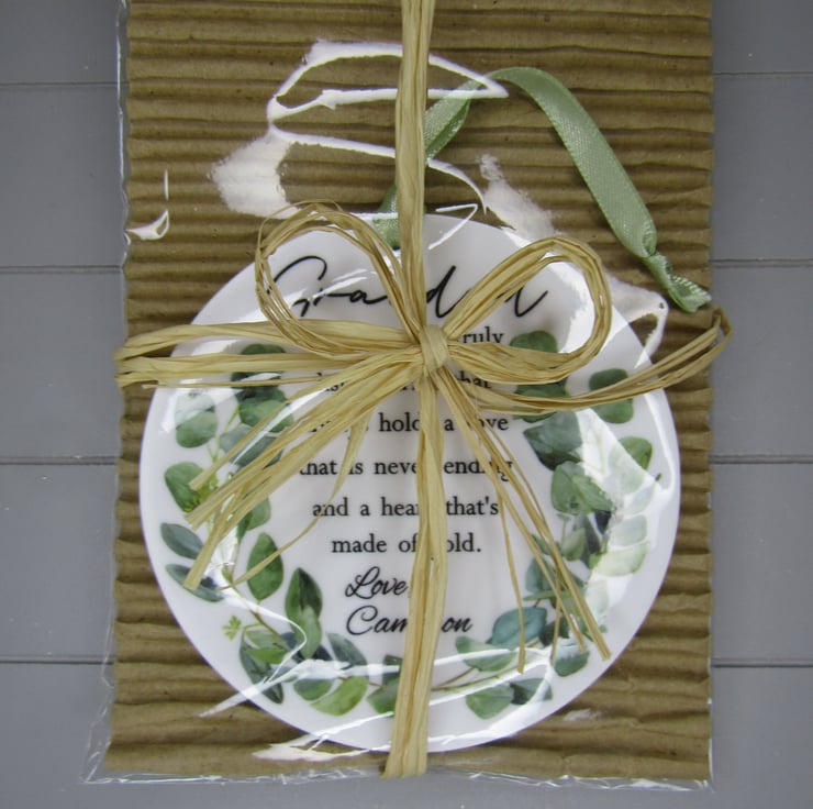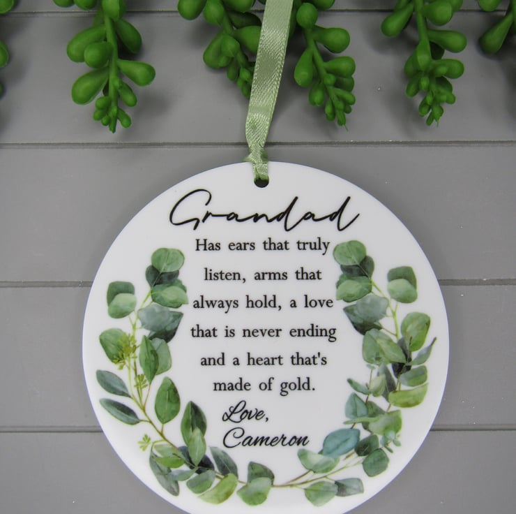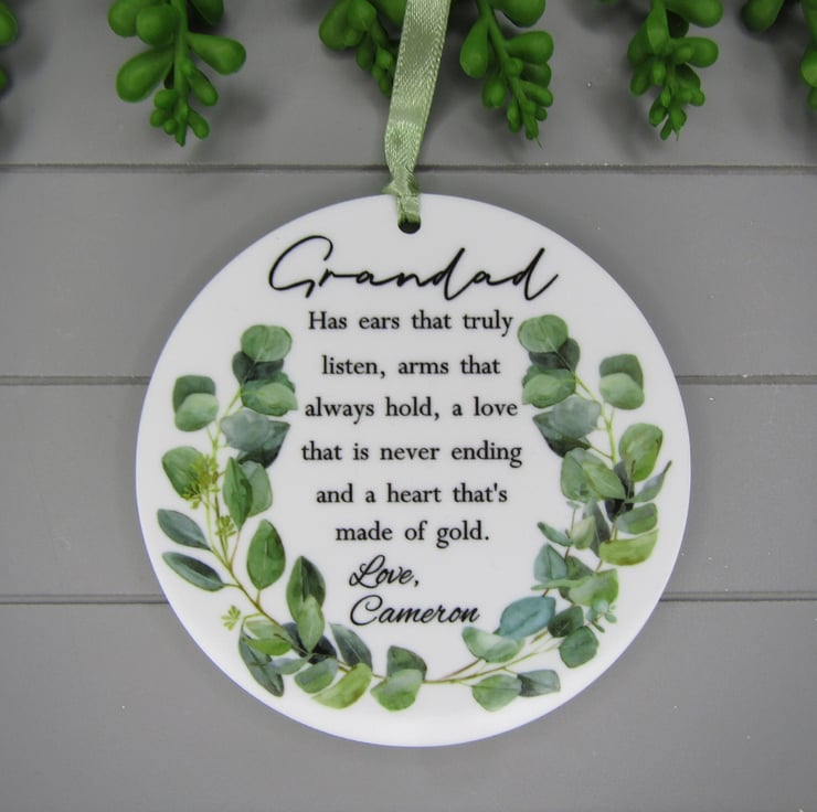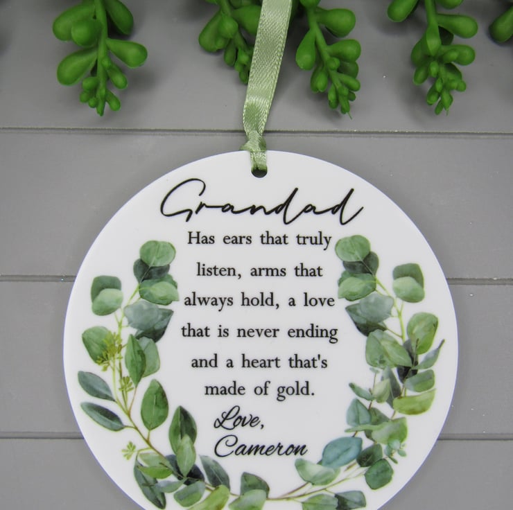 This 10cm acrylic ornament is personalised with the words- Grandad, Has ears that truly listen, Arms that always hold, A love that is never ending and a heart that's made of gold and is signed with the children's name. It can also be personalised with any relation - Grandpa, Gramps, Pops or personalised to a name relation of your choice. Please choose from the drop down menu which one you would prefer. It would make a precious keepsake for any occasion, Father's day, birthday etc. The disc is made from 3mm thick white acrylic.