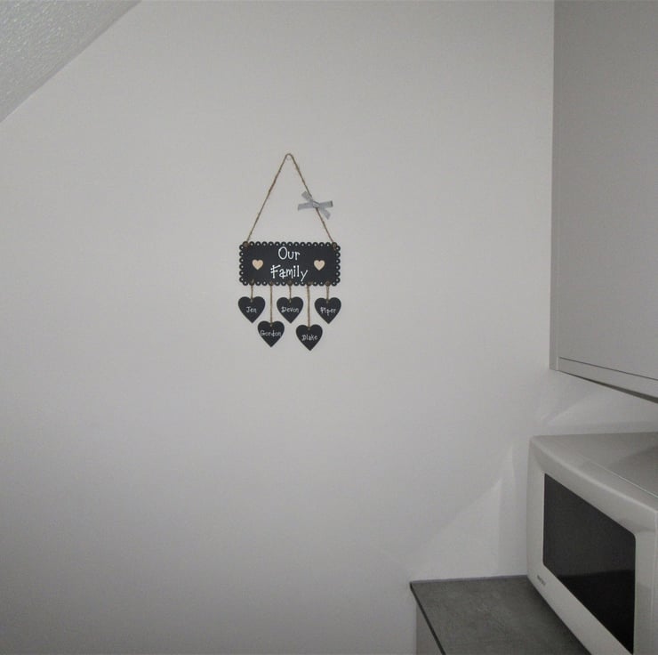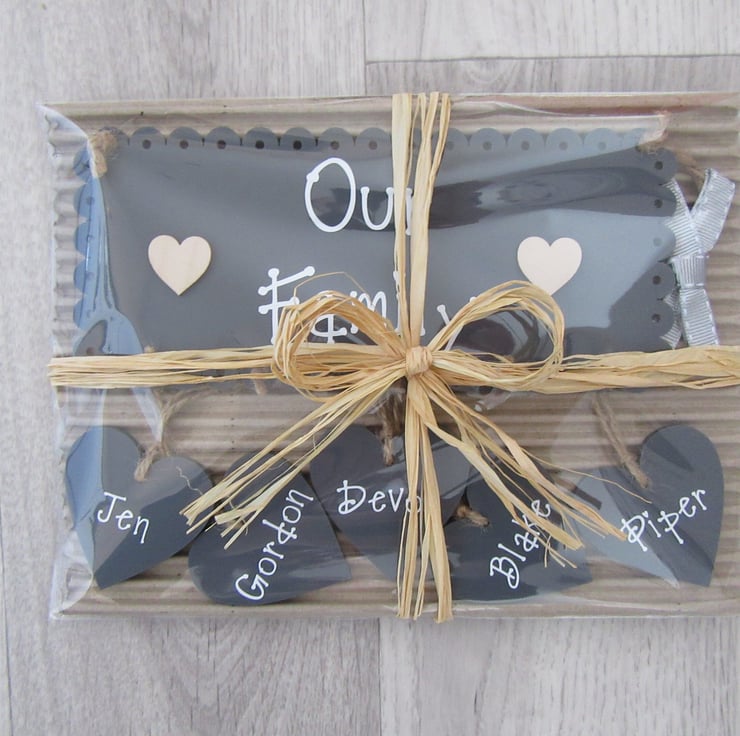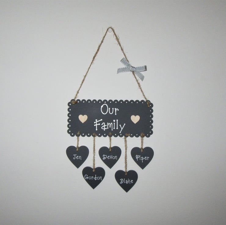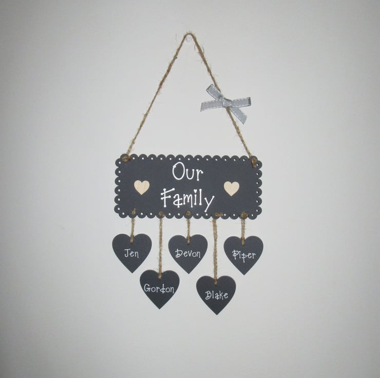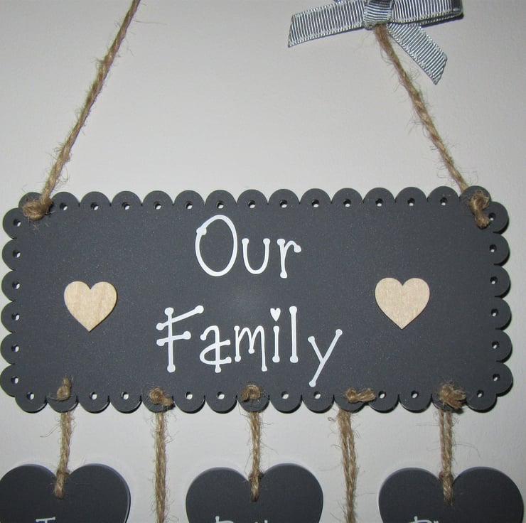 Main plaque & hanging hearts are made from high quality 3mm thick perspex acrylic in a dark mineral grey colour. Writing is in a matt white vinyl is embellished with wooden hearts and finished with a charcoal bow (different to one pictured). Other colours available in the main shop.