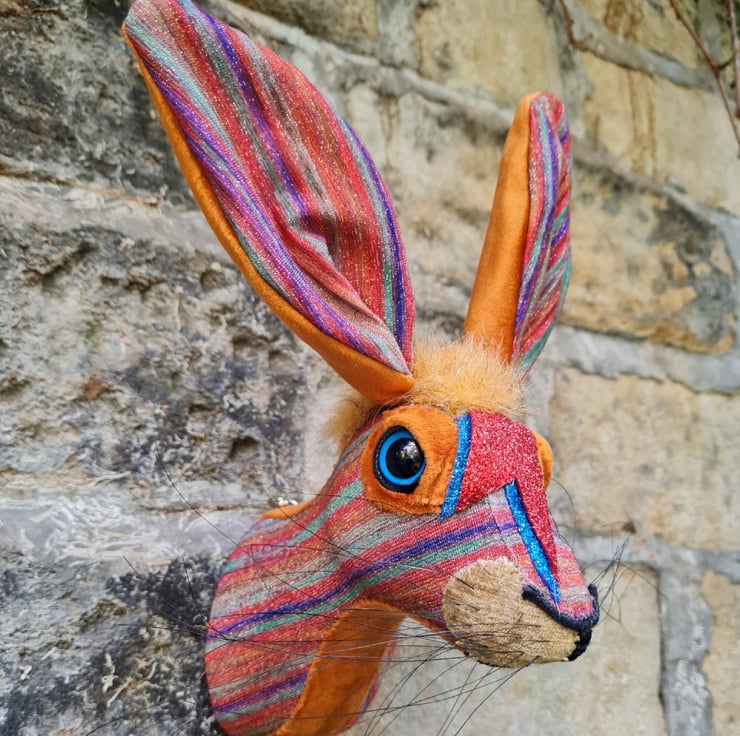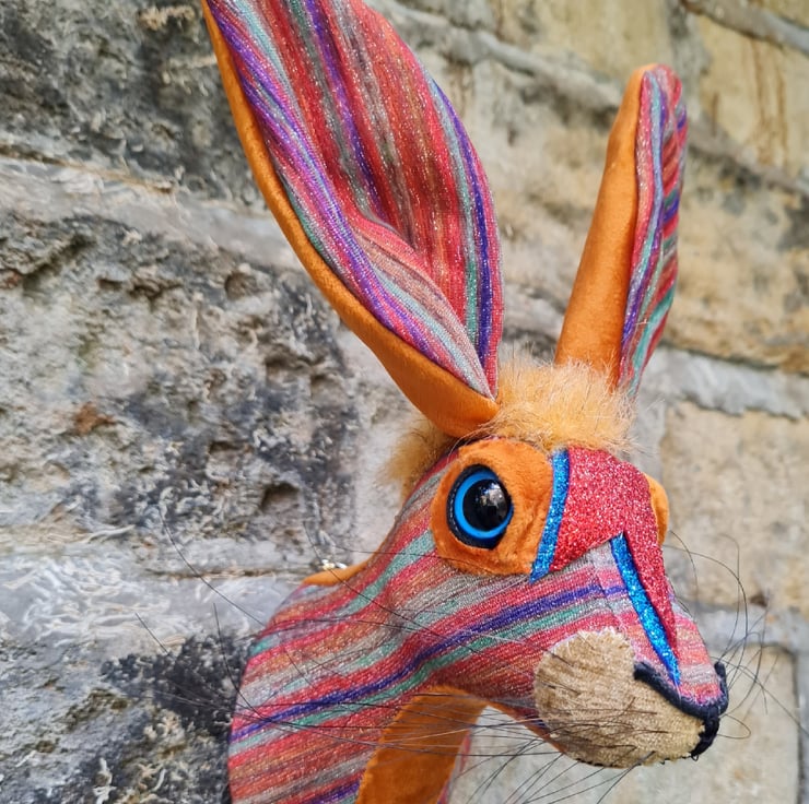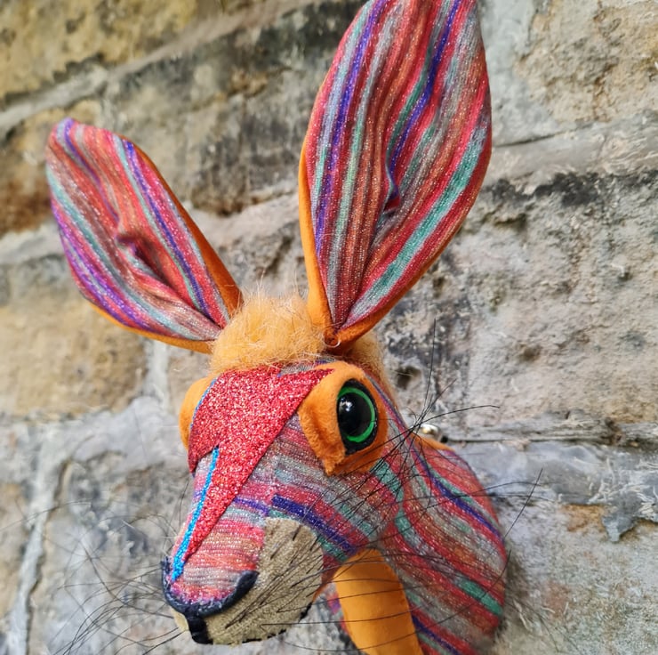This is Ziggy Haredust. A lifesize faux hare which I have handmade and covered in multi coloured striped lurex fabric.
