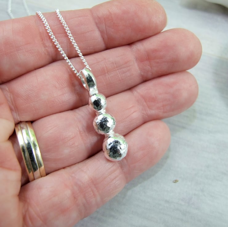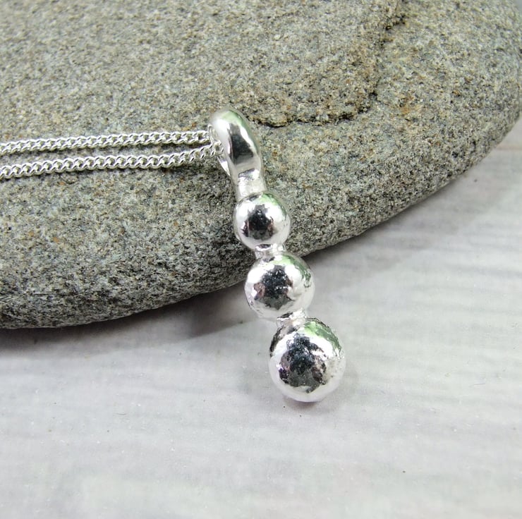 I have created the nuggets from molten recycled silver that has been heated until it forms the nuggets then left to cool. Once cooled and cleaned I have added a bail made from sterling silver wire that runs the length of the three pebbles all soldered securely together. Suspended from an 18 Sterling Silver chain. The pendant is solid silver and has a lovely weight to it and is very tactile.