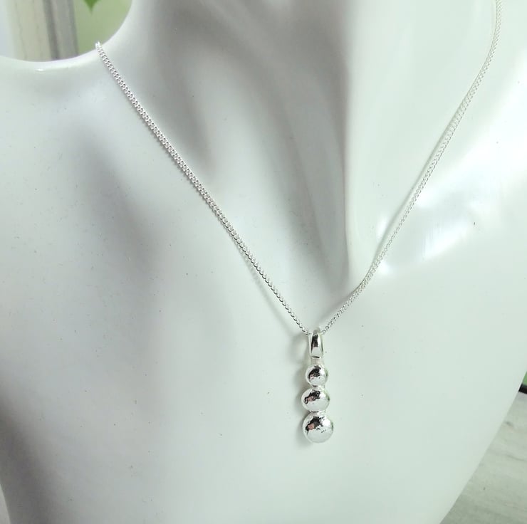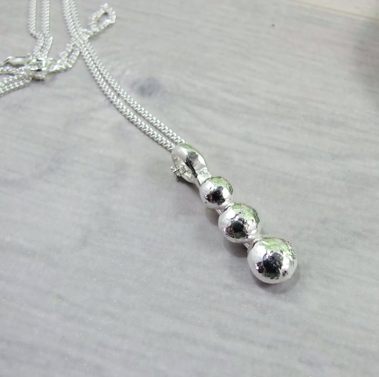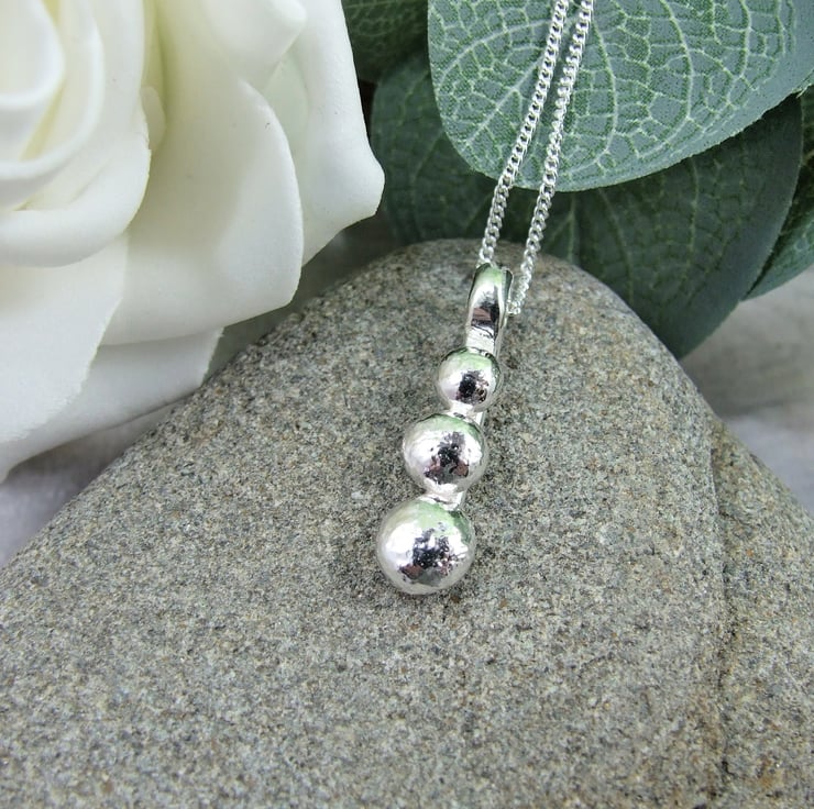 Recycled Silver Necklace. Solid Silver pebble shaped nuggets in graduated sizes stacked and soldered to create a pendant. Handcrafted from Recycled Silver on an 18 inch Sterling Silver Chain.