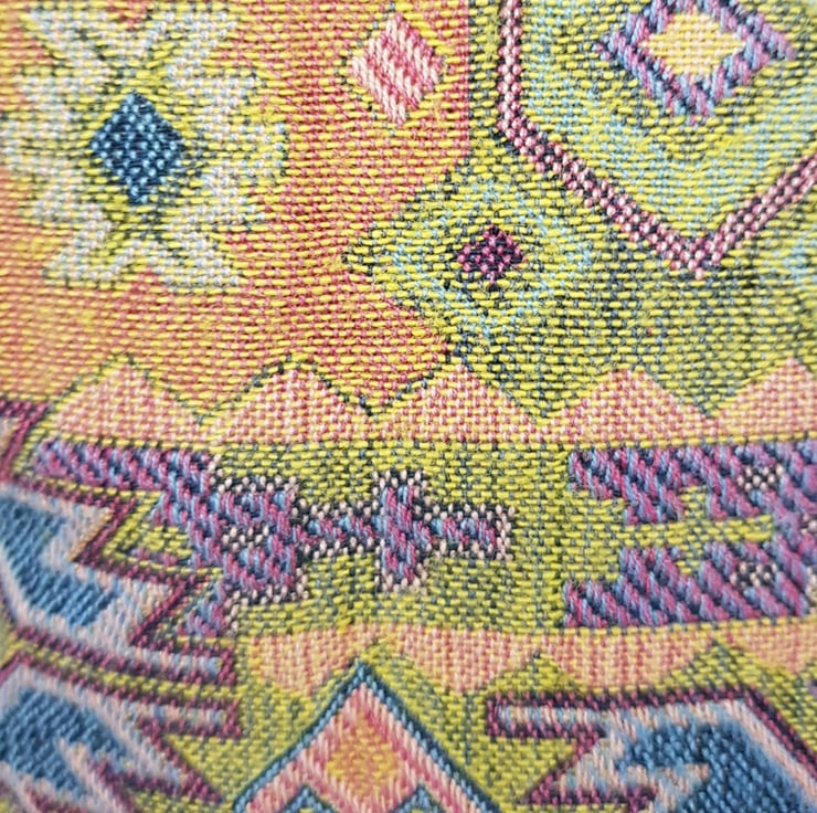 The outer fabric is a woven cotton and is complemented by a more shiny fabric inside. Both fabrics have been interfaced to add stability so it won't "flop". I have added a small loop so you can hang it up.