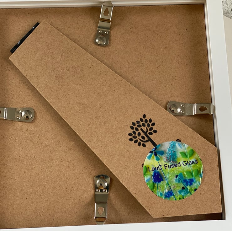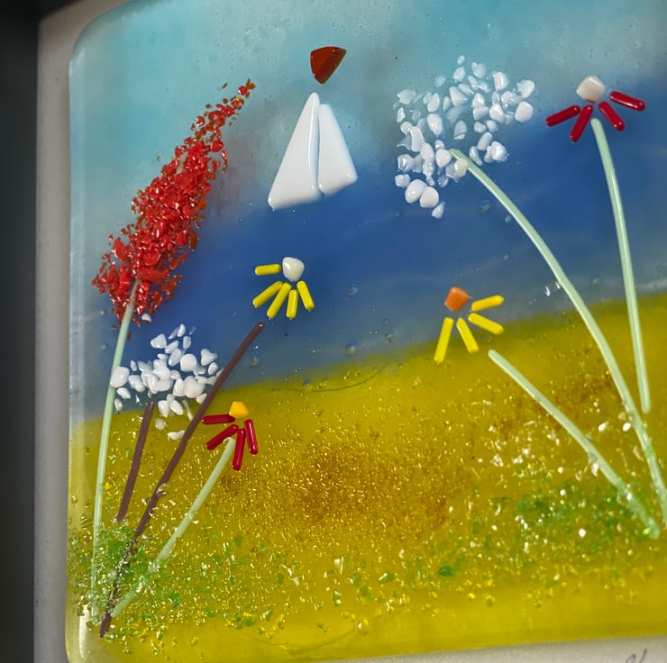 Pretty fused glass picture depicting a beach . All glass hand cut and kiln fired usung two layers of art glass . The art is in a quality white resin frame which can be free standing or wall hung . The vibrant colours are eye catching and it would look great in any room . This small picture is 15cm square .