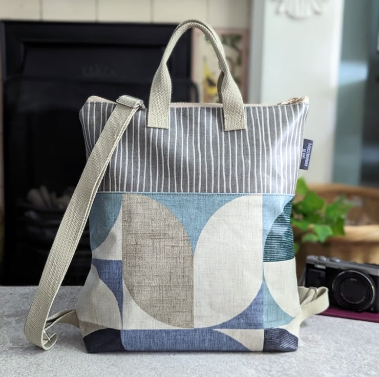 Handmade using geometric print in blues and grey striped matt PVC coated cotton (oilcloth), the backpack has a zipped top and is lined with a navy blue rip-stop nylon lining.