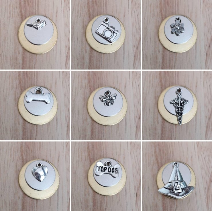 Please send a message during the checkout process with your info and choice of charm, or send me a private message.