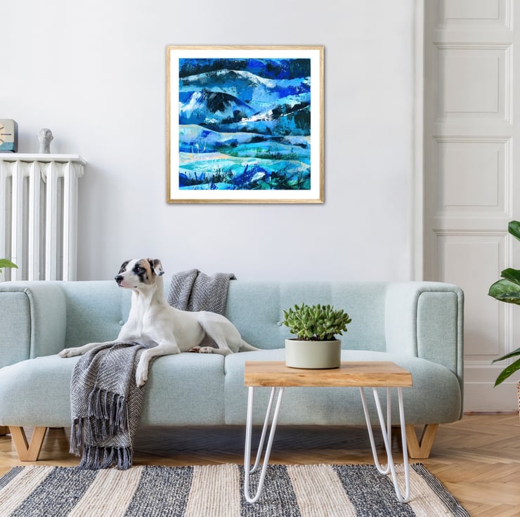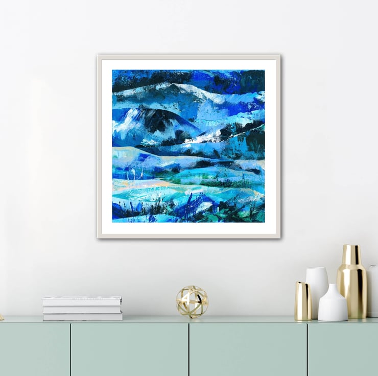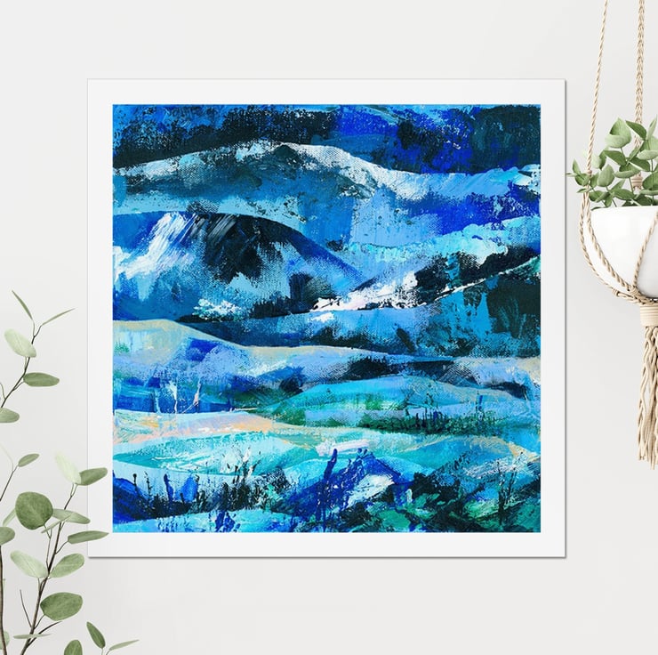 This is a Giclee reproduction print of my original, abstract landscape painting called 'Into The Blue'. The gently rolling countryside gives way to dramatic hills and mountains in the distance in this symphony of blues.