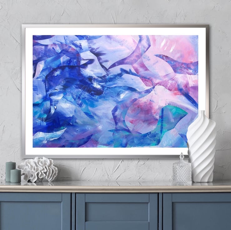 This is a giclee reproduction art print of my original painting called Exploration. It captures the joy, the excitement & sometimes the fear of trying & achieving something new. Shapes and colours have been layered one upon another as the journey of Exploration progressed.