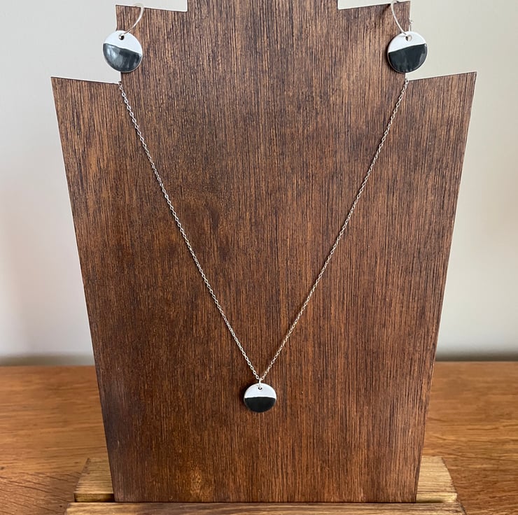 My handcrafted black and white monochrome porcelain earrings on sterling silver hoops are hand-painted with black glaze; the white is natural porcelain.