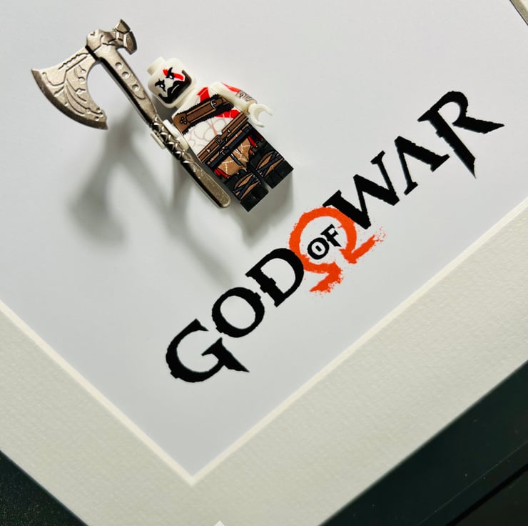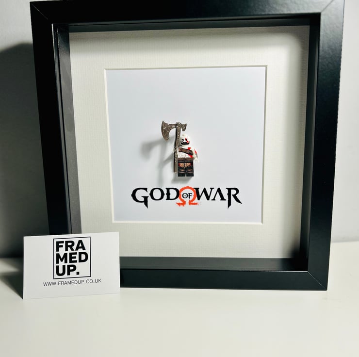 This frame features one big strong boy… we’ve had him recreated in minifigure form so he’s not so tough but he still looks mean and moody! One of the most popular games of recent times is God of War. We have mounted a mini version of KRATOS into a deep box frame and added the game logo underneath - perfect for any gaming fan!