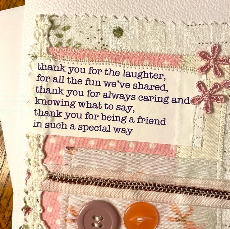 The wording: "Thank you for the laughter, for all the fun we've shared, thank you for always caring and knowing what to say, thank you for being a friend in such a special way"
