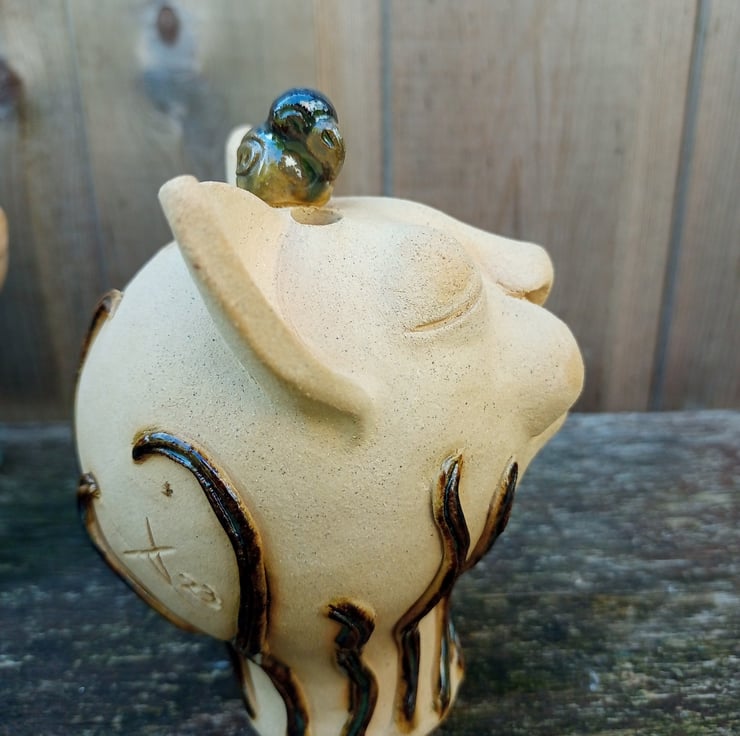 Fired stoneware ceramic with glazed details. Ornamental cat sculpture with grass and a bird. 4.5" tall approximately.