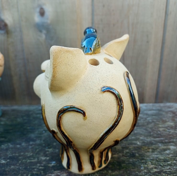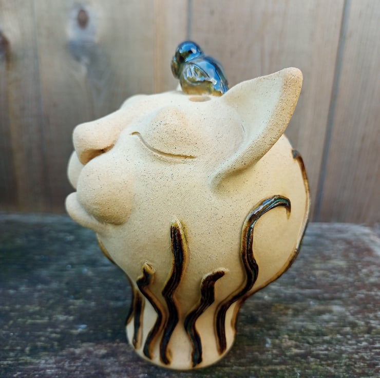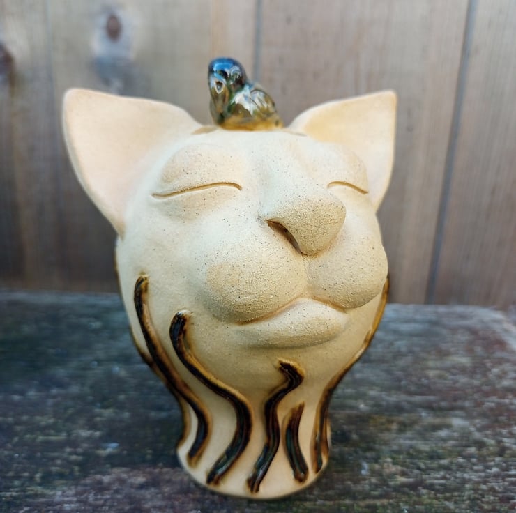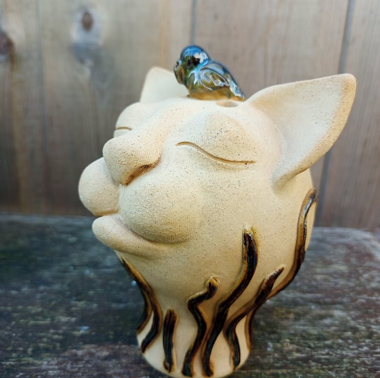 A quirky ornamental cat with a bird perched upon his head.