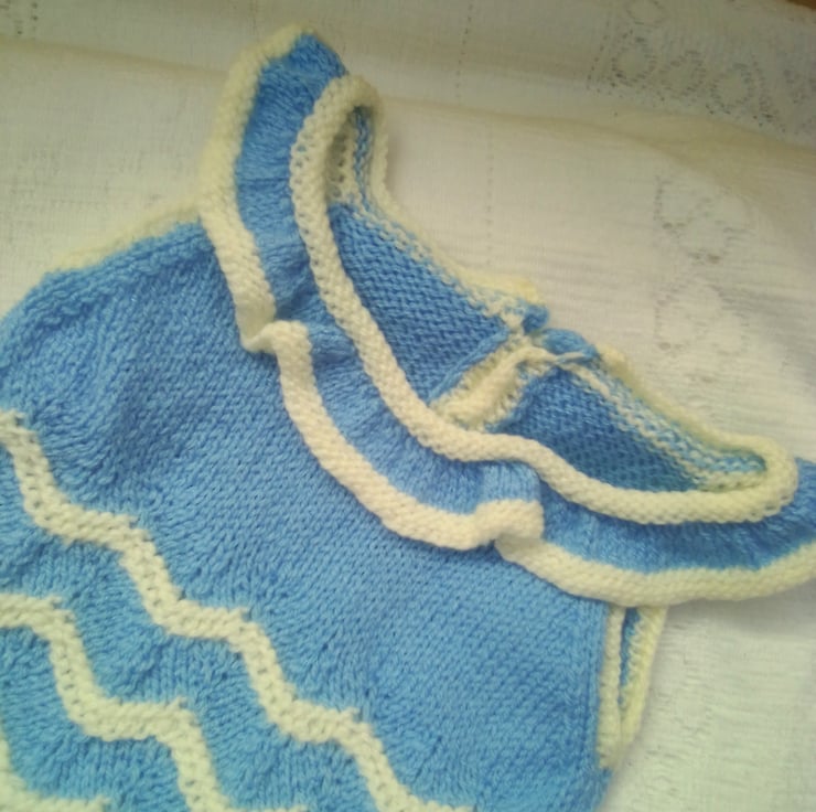 This pretty hand knitted dress with a chevron pattern and a frill at the neckline is in stock in this blue and white colour combination, in a size to fit a 1 - 2 year old girl with a 22 inch chest. It can also be hand knitted for you in a size and colour of your choice. The sizes available are shown in the table below and please state the colour required when you order. The processing time will be 1 - 2 weeks to produce and post to you.