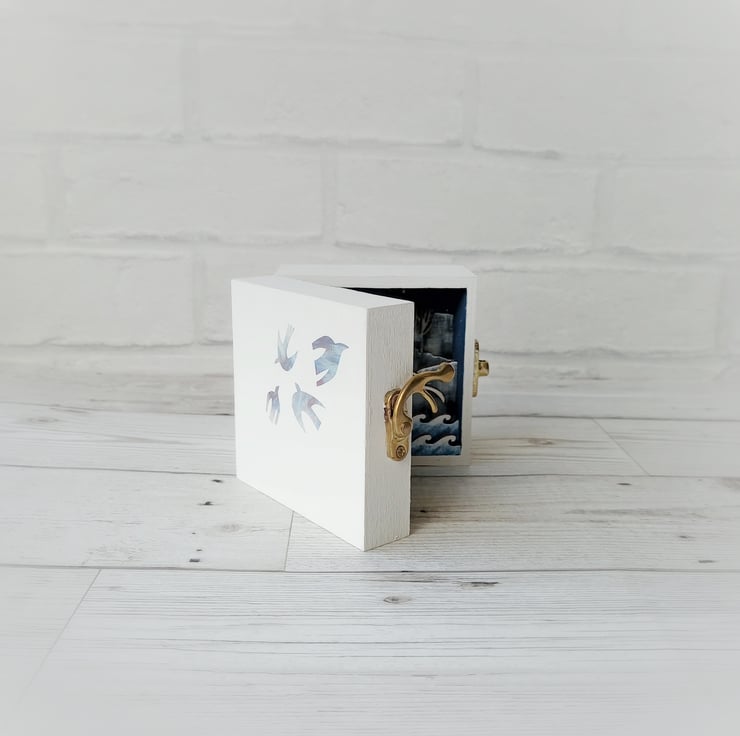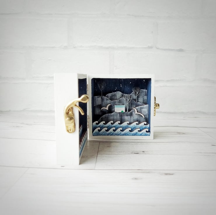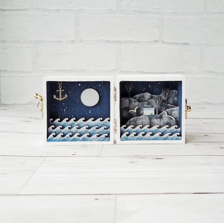 This miniature diorama opens up to reveal a little world in a box; a little cottage sits on a cliff overlooking the moonlit ocean. Gulls circle above the waves and a tiny anchor hangs inside the door. It is inspired by my love of all things nautical and my time working on stage sets in the theatre.