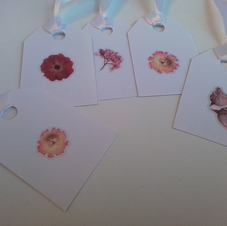 Each white tag measures approximately 7.5 max x 4.75 cm and has a co-ordinating ribbon.